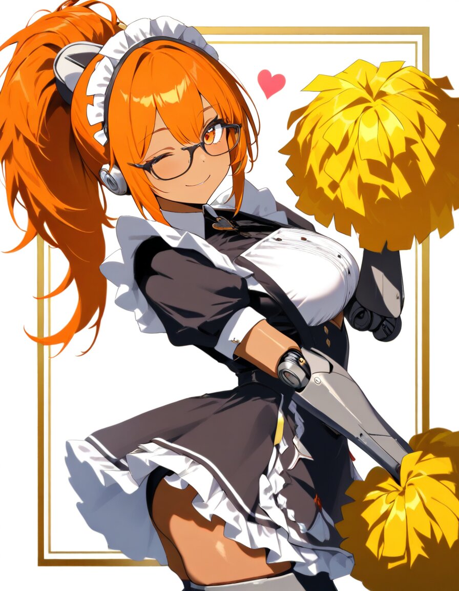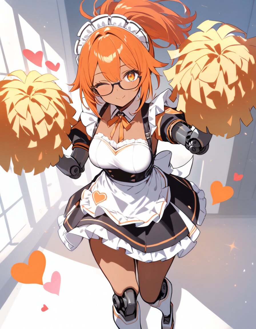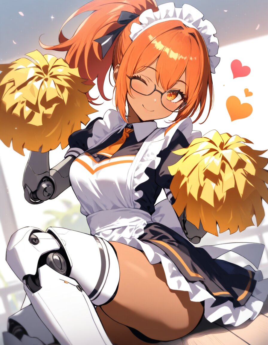 1girl, solo, dark skin, orange hair, ponytail, orange eye, glasses, maid, mechanical arms, mechanical legs, doll joints, smile, arched back, one eye closed, heart, pom pom \(cheerleading\), masterpiece, great score, high score, absurdres
