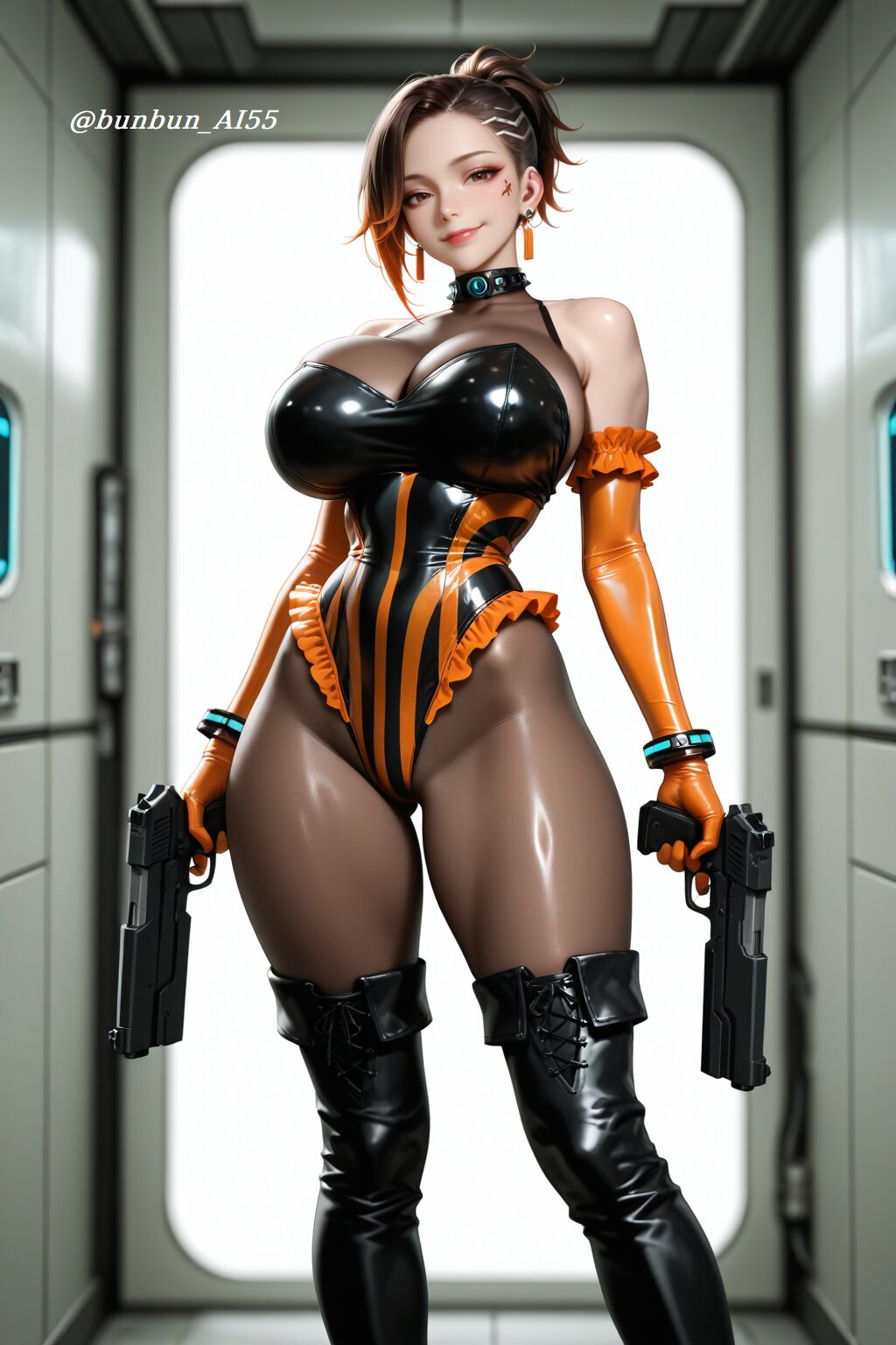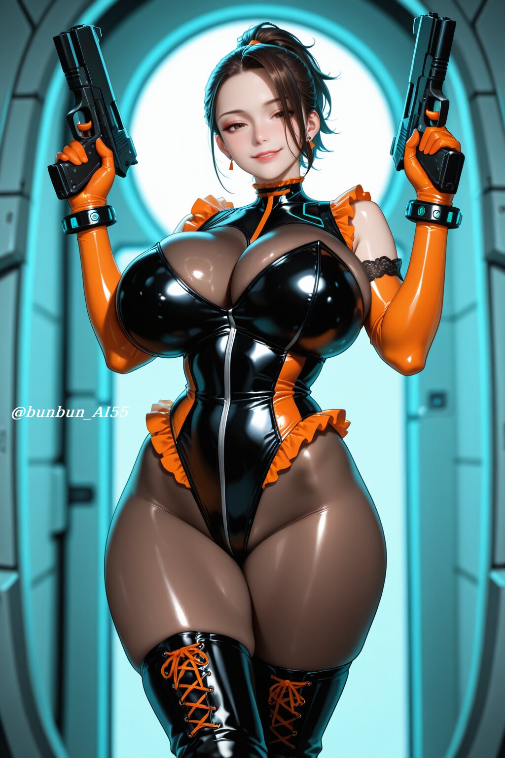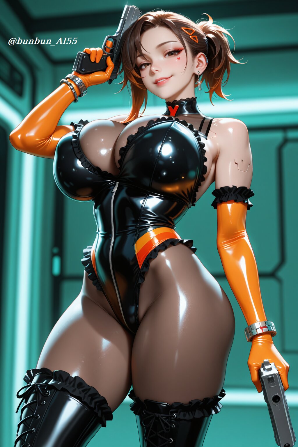 HDR, 8K,masterpiece, best quality, amazing quality, very awa, very aesthetic, absurdres, newest, detailed eyes, realistic eyes, realistic body, highres, ultra detailed, add detail, sharp detailes, sharp lines, sharp focus, (realistic, hyperrealistic), sexy style, perfect anatomy, depth of field, intricate details, high detail RAW color art, high contrast, (anime style, illustration style, manga style), ((mechanical, futuristic, cyberpunk)), BREAK perfect lighting, professional lighting, face lighting, (1girl, expressive and cute and beautiful girl:1.5, 18year old), (cute, kawaii, idol, sexy, model, beauty), (idol face, beautiful face, slim face, small face, cute face, detailed face, brown eyes, cyberpunk makeup, pink lips), (looking at viewer, alluring gaze, seductive smile), BREAK nsfw, (brown short ponytail), (jewelry, piercing, earrings, bracelet) (huge breasts, pointy breasts), (long legs, thick thighs, muscle legs), (perfect hands), (shiny skin, glossy skin), (super model body:1.2, muscle body:1.2, slim body, athletic body:1.2), BREAK (wearing a frilled high-leg leotard over sheer brown bodystocking:1.5, bodystocking:1.3, two-tone black and orange leotard:1.2, intricate frills, delicate lace frills), (orange enamel long gloves:1.2), (black and orange striped over knee long boots:1.2), (light reflections), (shiny, glossy, luster), (tight fit), BREAK (dynamic pose:1.2, action pose1.2), (aiming mechanical handgun at target:1.2, dual wielding), (detailed background, sci-fi space station background, futuristic, sci-fi), (face focus shot, medium shot, bust-up shot:1.2),