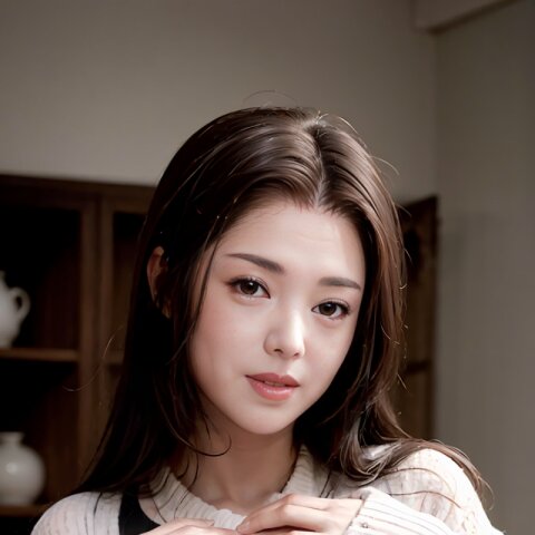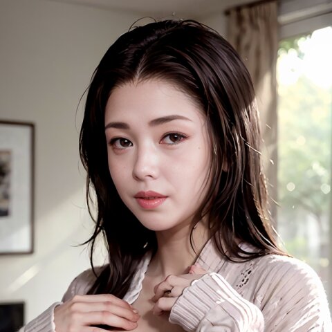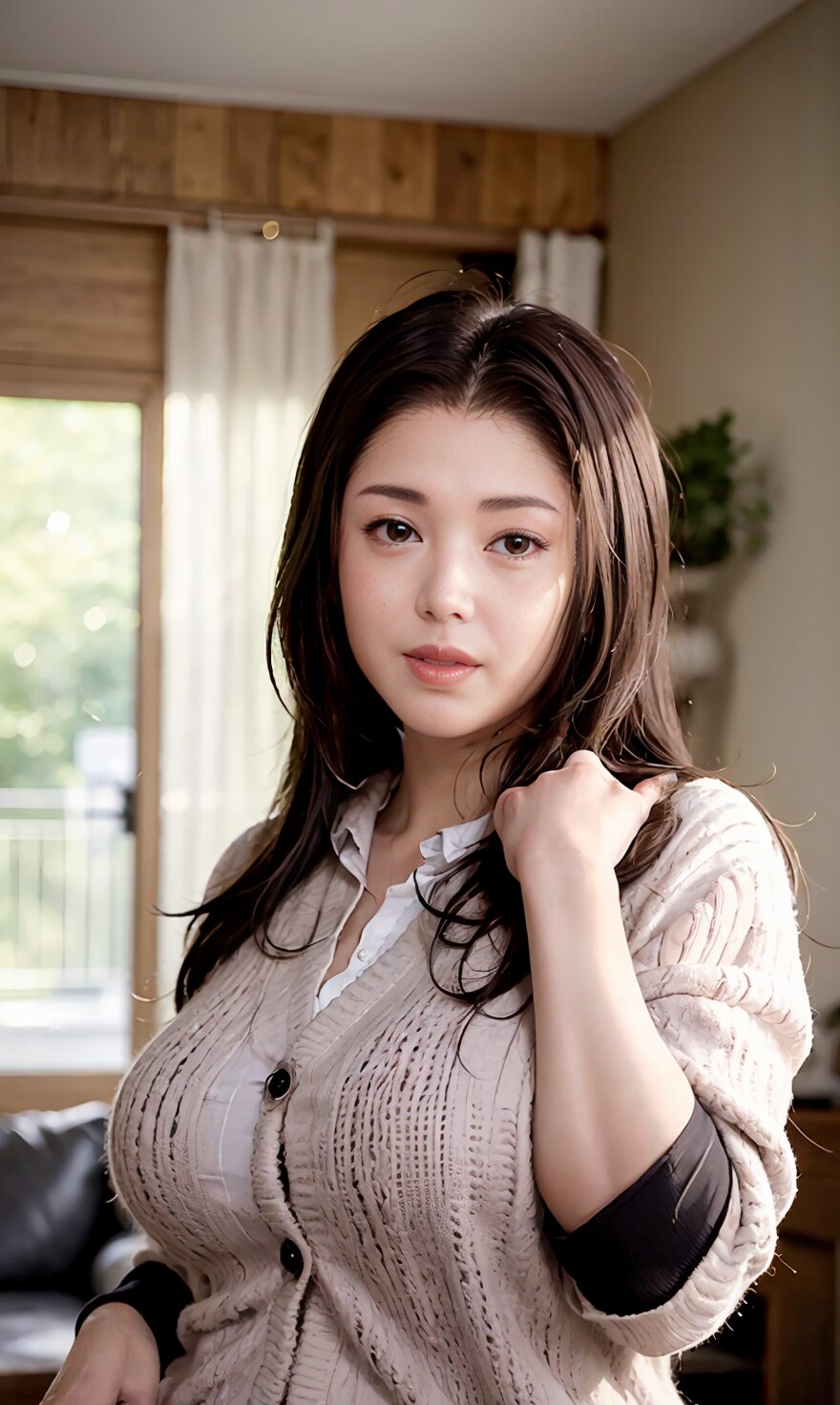 (8k, best quality, masterpiece:1.4), (realistic, photo-realistic:1.6), HDR, (incredibly absurdres:1.2), (vibrant color:1.2), ultra-detailed, (random pose, from front: 1.6), 1woman, wife, 32 years old, (chubby, huge breasts: 1.4), semi long hair, (upper body: 1.8), perfect body, highly detailed, shiny skin, shiny hair, looking at viewer, (pink cardigan: 1.4), walking in living room, <lora:saku_v02:0.6>