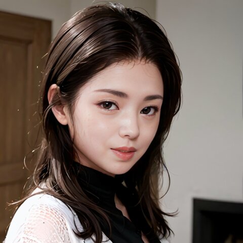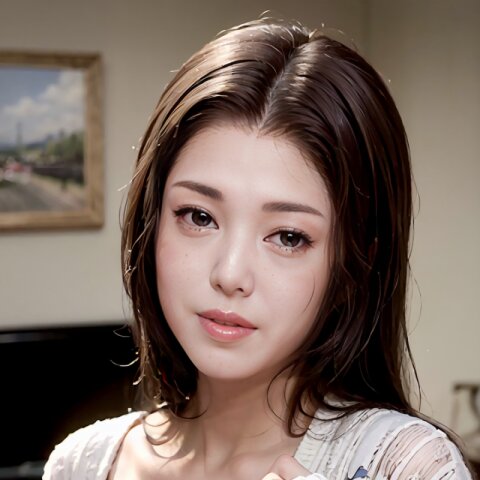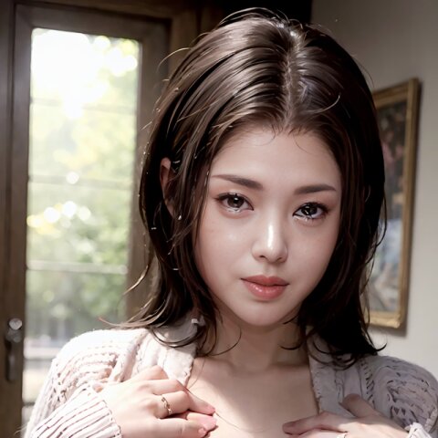 (8k, best quality, masterpiece:1.4), (realistic, photo-realistic:1.6), HDR, (incredibly absurdres:1.2), (vibrant color:1.2), ultra-detailed, (random pose, from front: 1.6), 1woman, wife, 32 years old, (chubby, huge breasts: 1.4), semi long hair, (upper body: 1.8), perfect body, highly detailed, shiny skin, shiny hair, looking at viewer, (pink cardigan: 1.4), walking in living room, <lora:saku_v02:0.6>