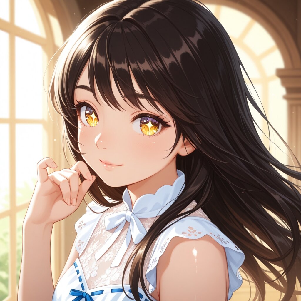 1girl, masterpiece, ultra detailed, long hair, soft hair, shiny hair, black hair, dark brown hair, subtle highlights, hair flowing in wind, delicate face, elegant expression, clear large eyes, vibrant iris, sparkling eyes, long eyelashes, well-groomed eyebrows, small cute nose, plump lips, slight smile, fair skin, smooth skin, natural complexion, lace dress, ribbon trim, elegant outfit, fantasy style, modern style, natural pose, graceful pose, playful gesture, looking at viewer, thoughtful expression, soft lighting, fantasy background, harmonious color palette, light and shadow contrast, dreamy beauty, elegant beauty
