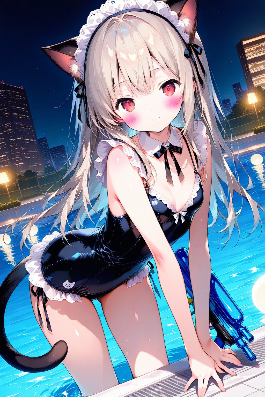 masterpiece, absurdres, highres, ultra detailed, best quality, high quality, high resolution, textile shading, super detailed skin, perfect anatomy, perfect hands, beautiful fingers, beautiful hands, fingertip, (1 cute girl: 1.3), (12yo), (child), kawaii, platinum hair, long hair, red eyes, (maid swimsuit), black cat girl, (black cat ears), (black cat tail), blush, smile, meditating with one eye, holding a water gun, releasing water from a water gun , pool, summer, dynamic angle,