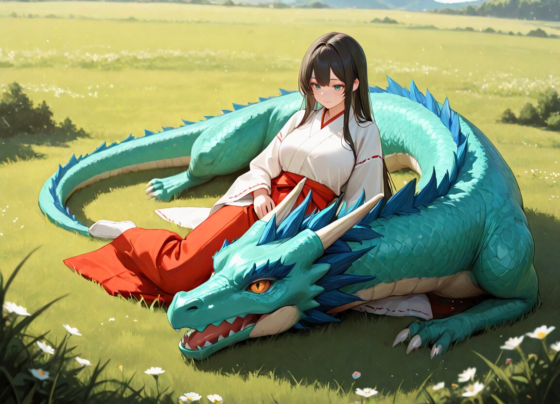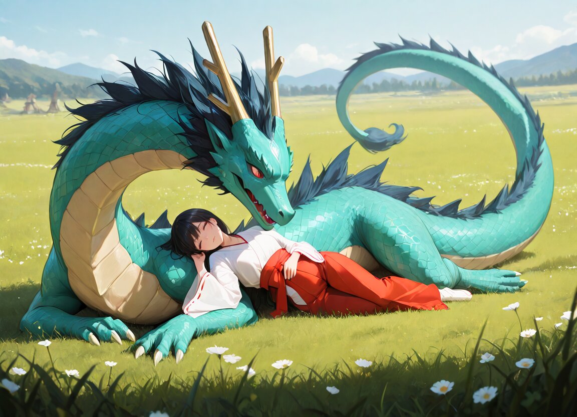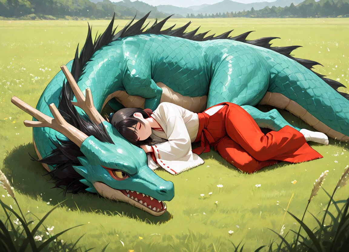 in the meadow, 1girl,1monster,oriental dragon,lap pillow, miko,, appropriate posture,appropriate configuration,ideal ratio body proportions,perfect anatomy, <lora:Fixhands_anime_bdsqlsz_V1:1>, masterpiece,best quality,newest,absurdres,highres,ultra high res,8K UHD,hyper-detailed,