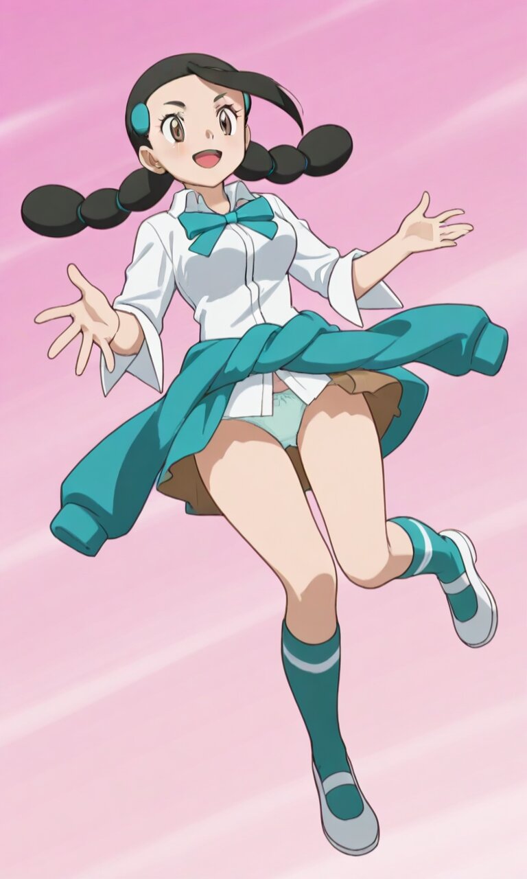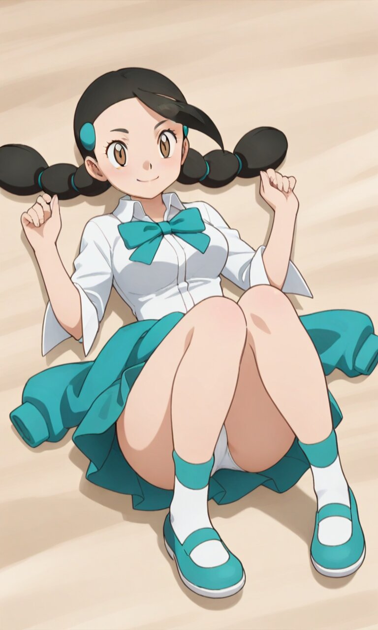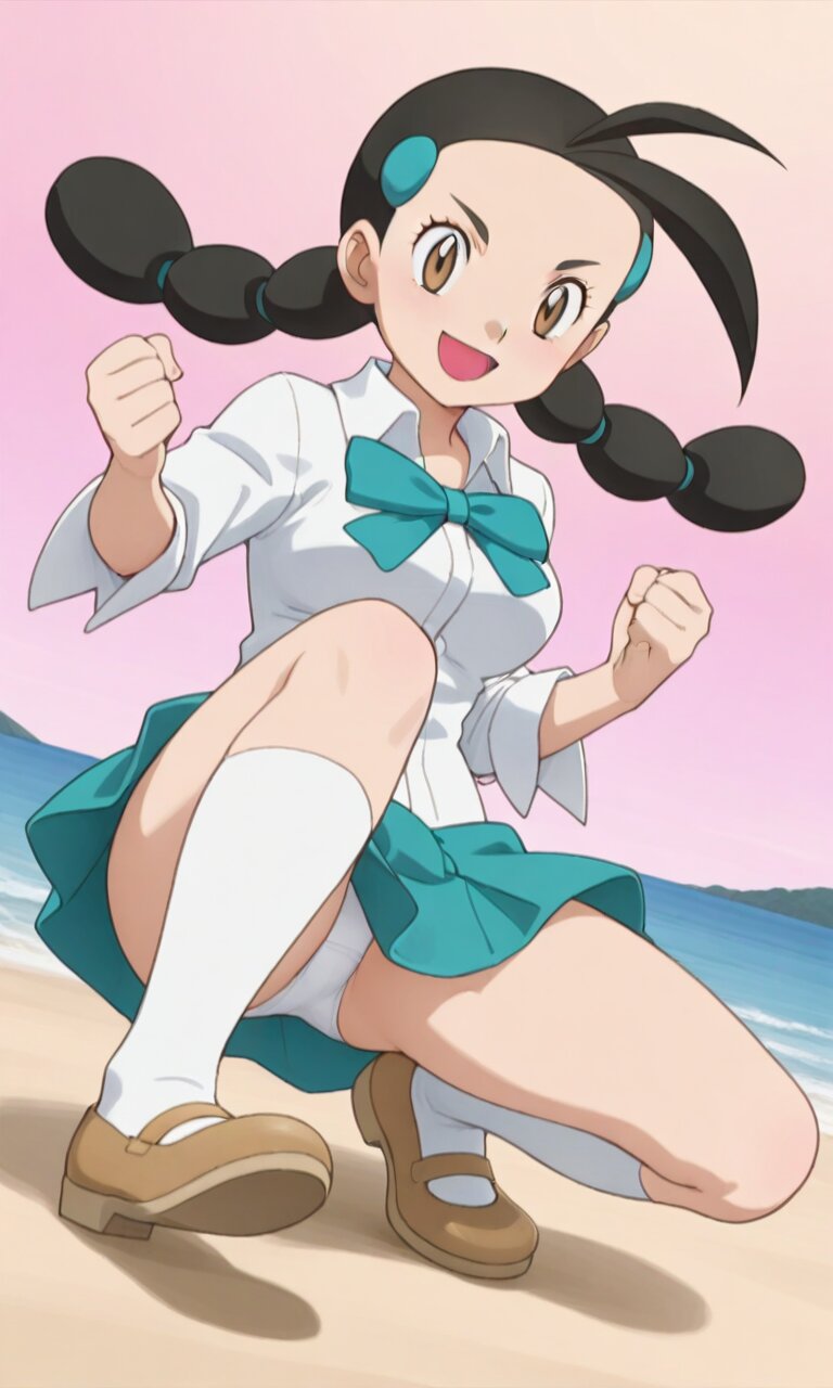 Candice,black_hair, brown_eyes, large_breasts, twintails, hair_ornament, best quality}, {very aesthetic}, {ultra-detailed}, {best illustration} nsfw, perfect hands, perfect face, perfect eyes, perfect light, dynamic light, natural light, full body an anime girl on the beach looking very nice and attractive on the cover, 1girl, underwear, panties, solo, school uniform, panties, dutch angle, smile, skirt