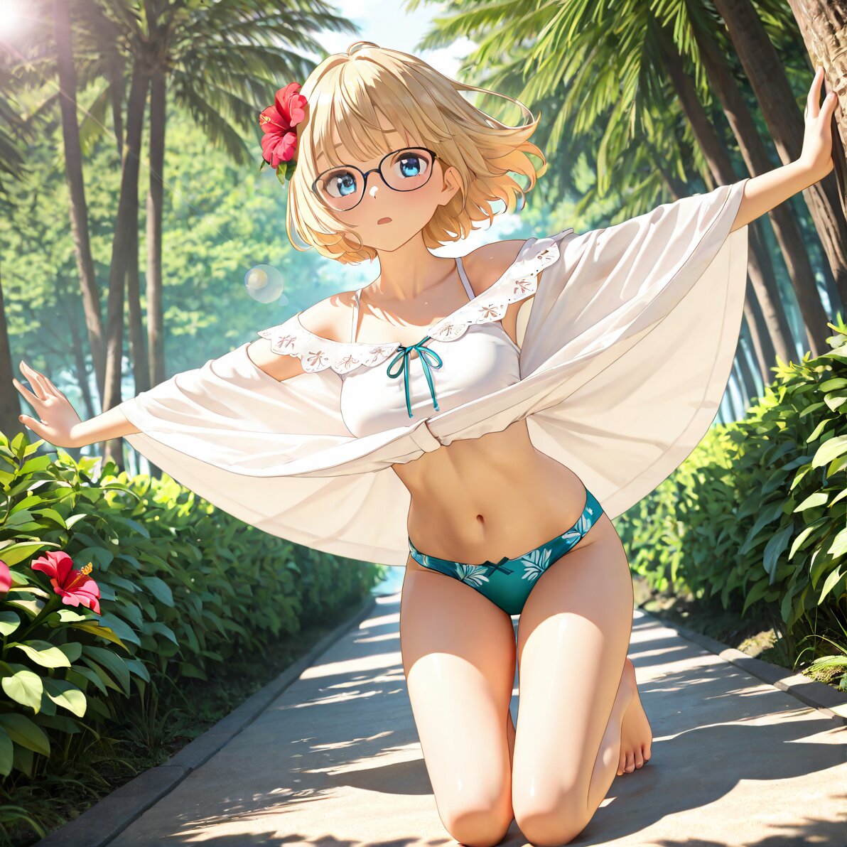 masterpiece, best quality, amazing quality, 4k, very aesthetic, high resolution, ultra-detailed, absurdres, newest, scenery, 3d, rendered, backlit, 1girl, solo, glasses, blonde hair, short hair, choppy bangs, =_=, blue eyes, panties, fitted aloha, hibiscus flower pattern, full body, medium breasts, modern urban renewal area, portrait, dynamic, floating hair, BREAK, hands, fingers, (dappled sunlight, sunburst, lens flare:1.2), vignetting, dramatic shadow, cinematic lighting, rim light, detailed background, depth of field, vignetting, volumetric lighting