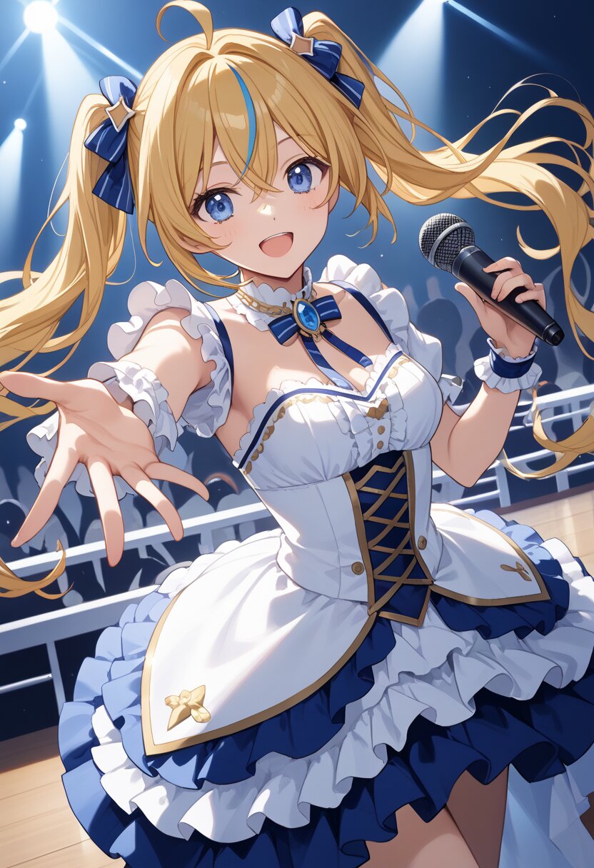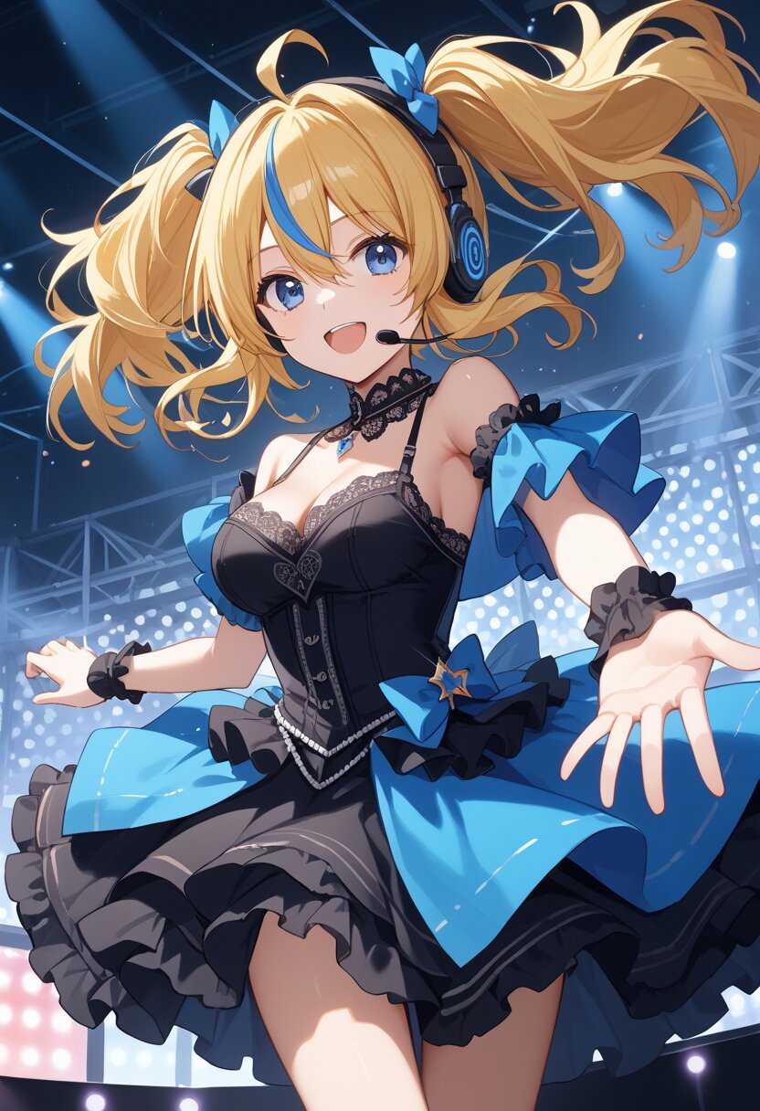 score_9,score_8_up,score_7_up,source anime,best quality,masterpiece,8k,extremely detailed CG unity 8k wallpaper,(dynamic_angle:1.2),twintails,long hair,blue eyes,blonde hair,blue streaked hair,ahoge,bangs between eyes,idol,stage,smile,idol costume,Slightly_open_mouth,reaching,scillium,headset,rim light,off-shoulder,armpits,medium breasts,dance stage,concert venue,