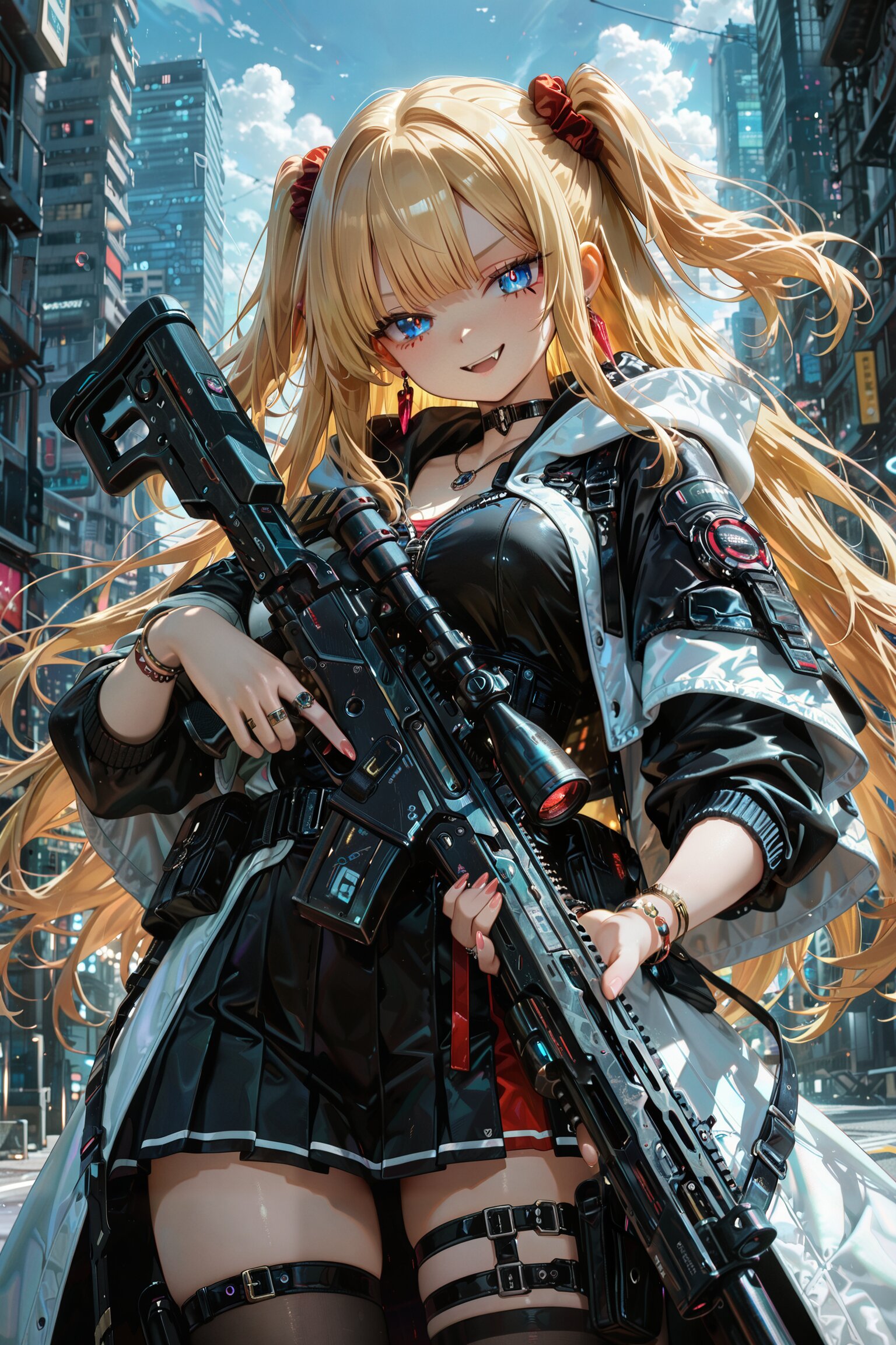 masterpiece, best quality, best quality, year 2024, newest, highres, absurdres, very Aesthetic, high detail, anime_style, kawaii, cute, 1girl,solo, medium breasts, blond, long hair, two side up, blue eyes, anime eyes, anime face, wispy bangs, fang, evil smile, futuristic, cyberpunk, black jacket, white coat, hooded capelet, skirt, belted skirt, thighhighs, hair scrunchie, choker, thigh straps, jewelry, red earrings, necklace, bracelet, ring, belt, thigh holster, belt pouch, hood down, sniper rifle, trigger discipline, cowboy shot, windy, city, blue sky,