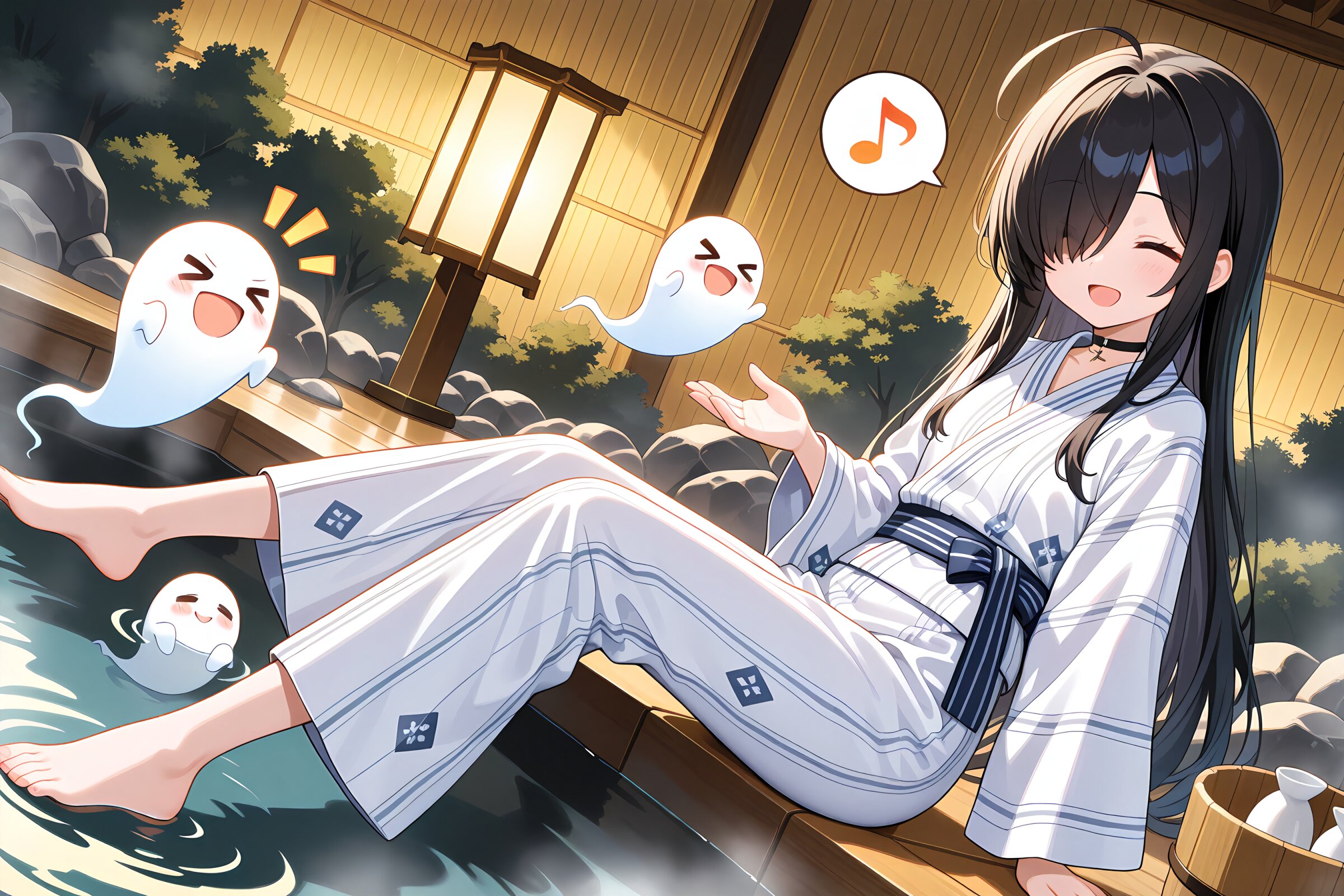 1 little girls, solo, diagonal angle, masterpiece, best quality, amazing quality, very aesthetic, black hair, long hair, ahoge, (hair over one eye:1.2), =_=, open mouth, smile, cheerful, relaxing, +++, notice lines, choker, long white yukata, long sleeves, barefoot, long pants, closed neck, soaking, sitting, spoken musical note, ghost, > <, onsen, steam, summer,