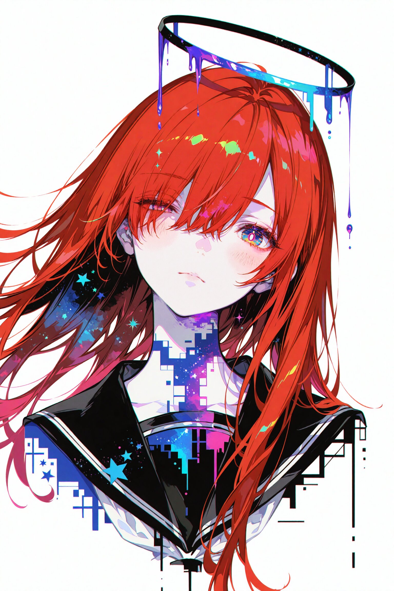 1girl, solo, simple background, white background, feng shui, looking at viewer, zooming in girl, portrait, monochrome, color test, digital dissolve, static, abstract background, dynamic composition, limited palette, (colored eyes:1.2), half-closed eye, head tilt, pink eyes, blue pupils, multicolored eyes, colorful, long hair, star \(symbol\), blush, floating hair, halo, straight-on, chromatic aberration, hair over one eye, colored skin, closed mouth, red hair, white skin, expressionless, one eye covered, purple liquid, no lineart, The composition features a central character with long, flowing hair that transitions into a vibrant mix of colors and patterns, creating an abstract and dynamic background. Surrounding this figure are various elements such as geometric shapes and lines, contributing to the overall complexity and intrigue of the piece