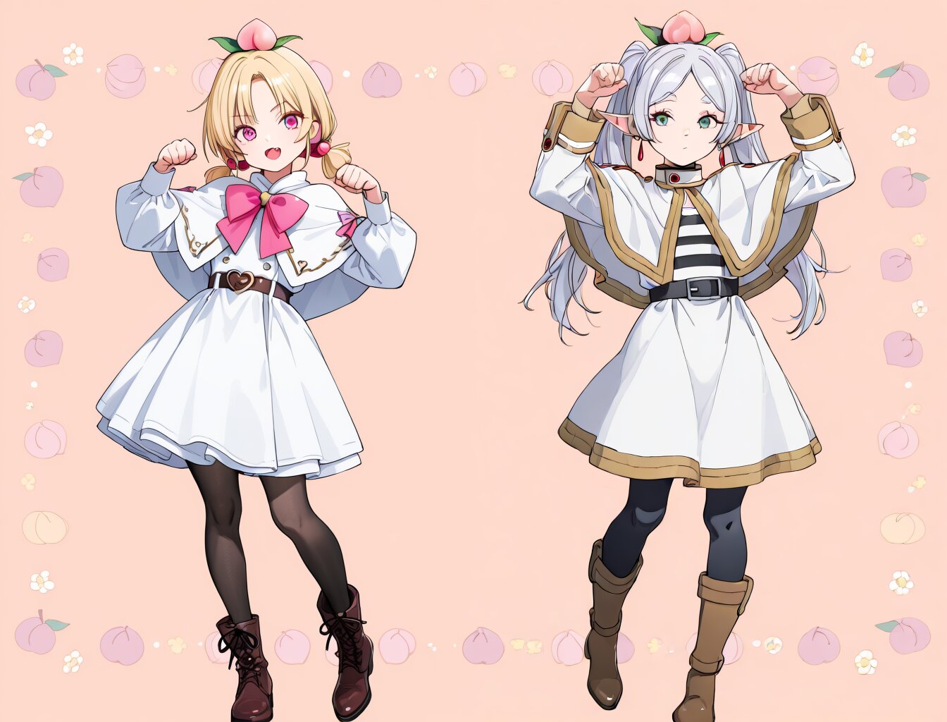 masterpiece,best quality,ultra detailed,(2girls:1.3), AND masterpiece,best quality,ultra detailed,(2girls:1.3),blonde hair,pink tips,pink bow,hair_bobbles,bob cut,(low twintails:1.2),(short twintails:1.2),pink eyes,fang,parted bangs,earrings,jewelry,white dress,long sleeves,white capelet,belt,black pantyhose,boots,brown footwear,(peach background:1.2),kawaii background,cat_pose,(peach on the head:1.3), AND masterpiece,best quality,ultra detailed,(2girls:1.3),frieren,green eyes,long hair,twintails,parted bangs,earrings,jewelry,dress,long sleeves,white capelet,belt,black pantyhose,boots,brown footwear,(peach background:1.2),kawaii background,cat_pose,(peach on the head:1.3),