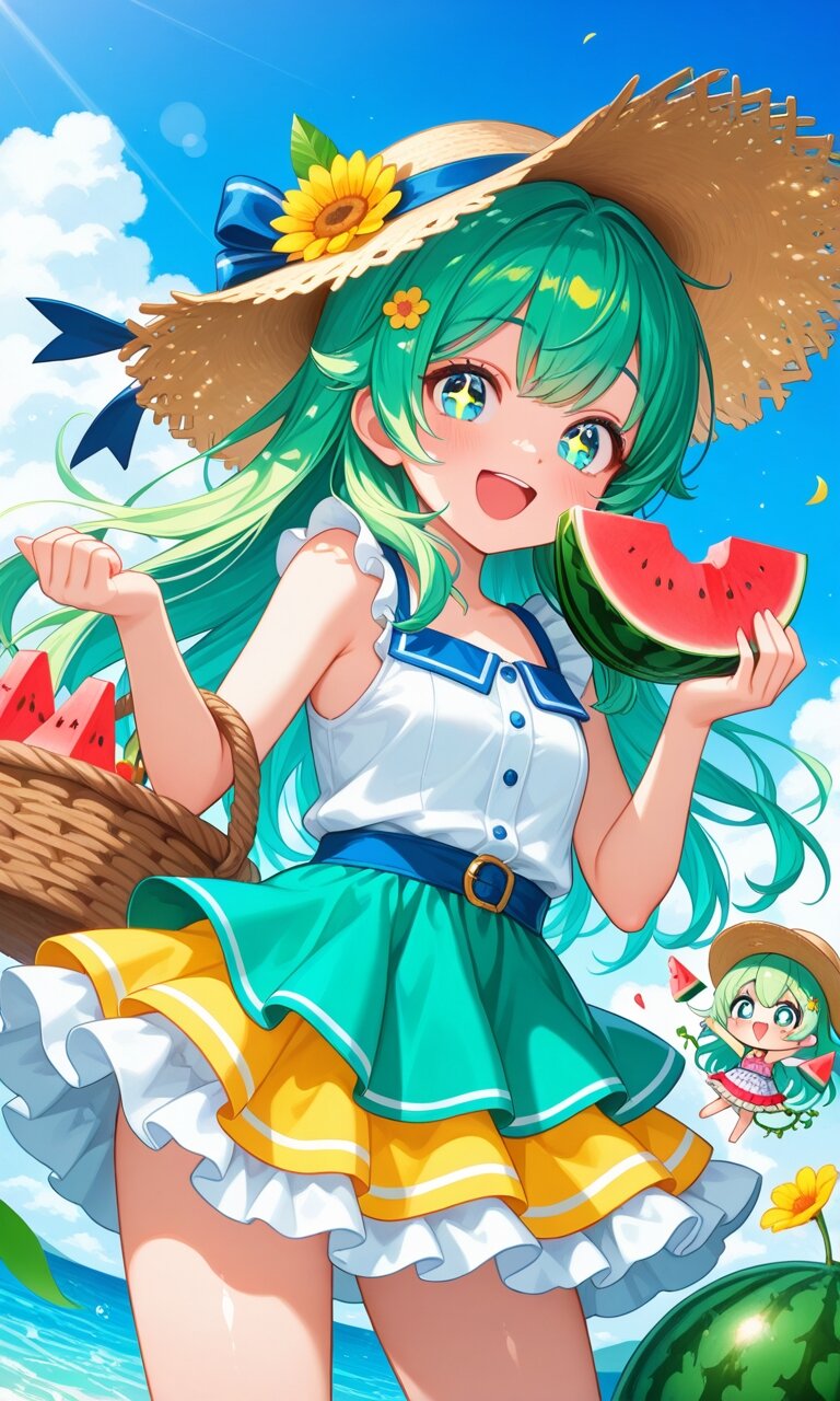 1girl, watermelon, summer, cheerful, green hair, long hair, striped hair, pink and green, sleeveless top, frilly skirt, polka dots, watermelon slice, hat, basket, holding food, smiling, looking at viewer, large eyes, bright eyes, sparkling eyes, mischievous, playful, friendly, sunny, vines, flowers, blue sky, chibi, cute, colorful, shiny hair, rosy cheeks, seeds, summer outfit, masterpiece, ultra detailed, vibrant colors, happy, lively, inviting pose, joyful, festive, Watermelon Day celebration