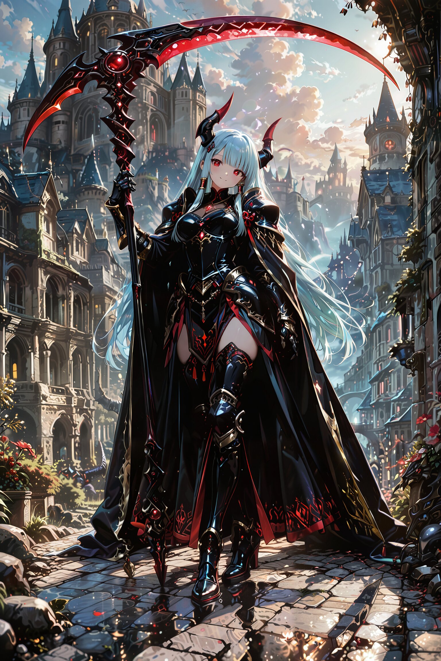 masterpiece, best quality, best quality, year 2024, newest, highres, absurdres, very Aesthetic, high detail, (anime_style, kawaii, cute:1.2), 1girl,solo, medium breasts, light blue hair, long hair, red eyes, anime eyes, anime face, wispy bangs, smile, (head tilt), black armor, cape, shoulder armor, breastplate, gauntlet, tace, tasset, red trim, gold trim, jewelry, decoration, reflective silver, hair ornament, hair_tubes, hair_horns, horns, red earrings, necklace, glowing scythe, red glow, glowing, holding scythe, looking at viewer, full body, windy, fantasy setting, heroic fantasy castle, outside, fortified town,