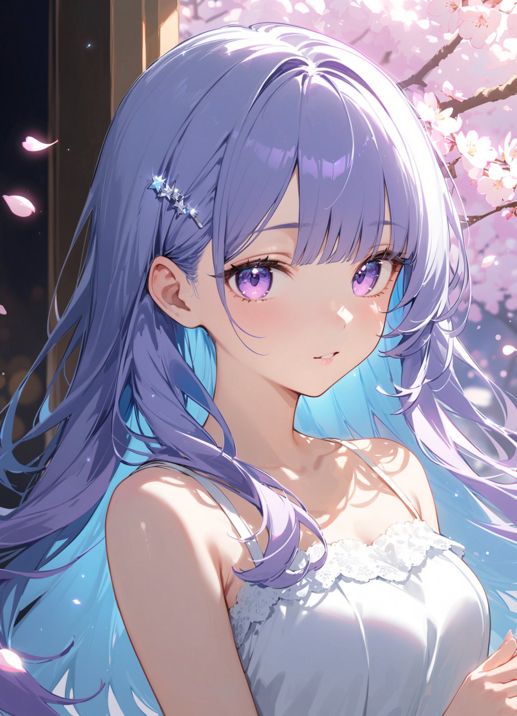 (masterpiece:1.3), (best quality:1.2), dreamy pastel bokeh, floating cherry-blossom petals, soft rim light, crisp anime lineart, soft cell shading, high detail, elegant atmosphere, soft anime face, teenage, pastel purple hair, (light blue inner hair:1.3), fluffy long hair, loosely wavy hair, soft flowing hair, straight-cut bangs, star-shaped hairpin, calm violet eyes,