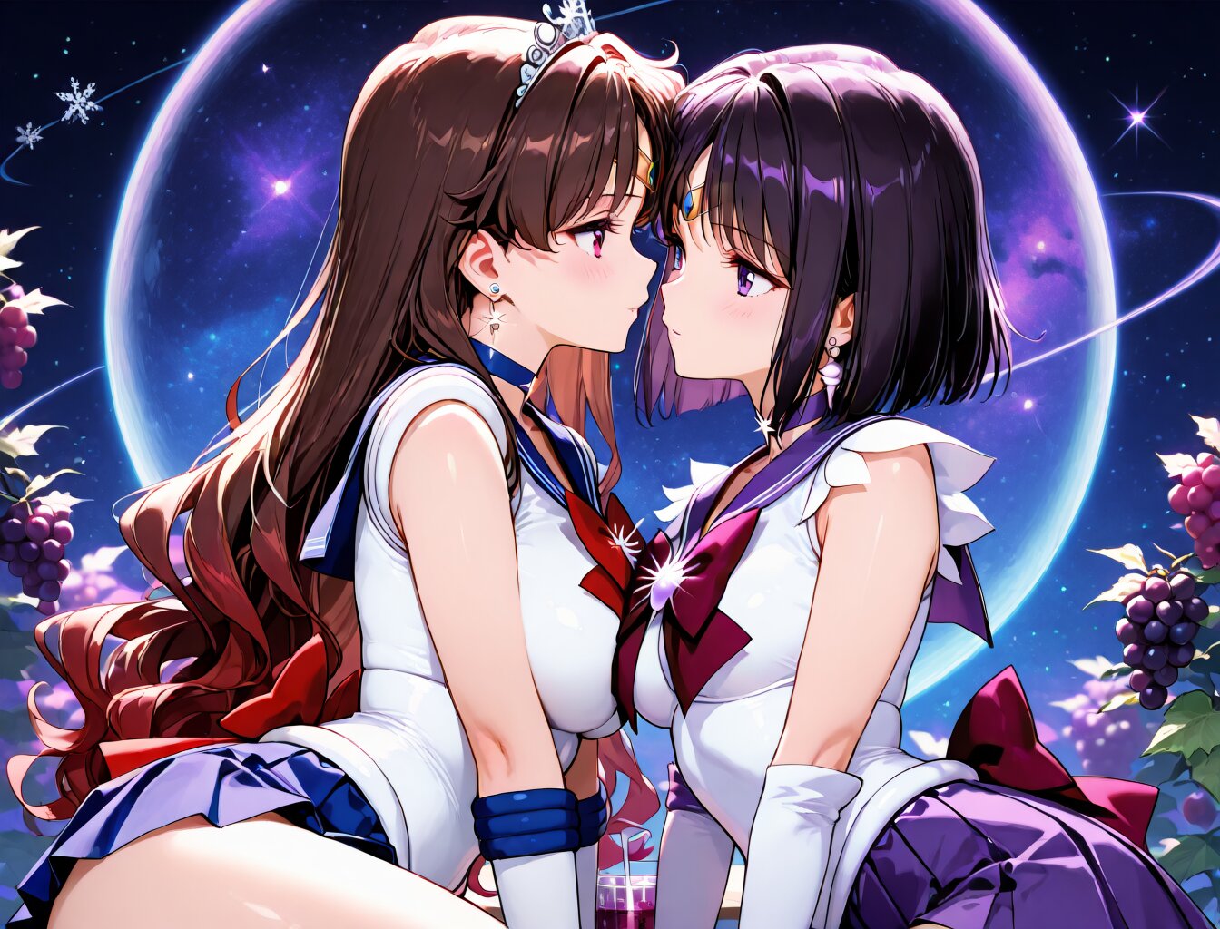 masterpiece,best quality,ultra detailed,(2girls:1.3), AND masterpiece,best quality,ultra detailed,(2girls:1.3),dark brown hair,red tips,red bow,wavy hair,long hair,red eyes,big breast,seductive_smile,snowflake_hair_ornament,tiara,jewelry,earrings,sailor collar,purple sailor collar,purple choker,red bow,sailor senshi uniform,white shirt,sleeveless shirt,purple skirt,white elbow gloves,knee boots,grape background,cosmic background,grape juice,1cup,eye_contact, AND masterpiece,best quality,ultra detailed,saturn_a_pxl,sailor saturn,short hair,black hair,bob cut,purple eyes,tiara,jewelry,earrings,sailor collar,purple sailor collar,purple choker,red bow,sailor senshi uniform,white shirt,sleeveless shirt,purple skirt,white elbow gloves,knee boots,grape background,cosmic background,grape juice,1cup,eye_contact,