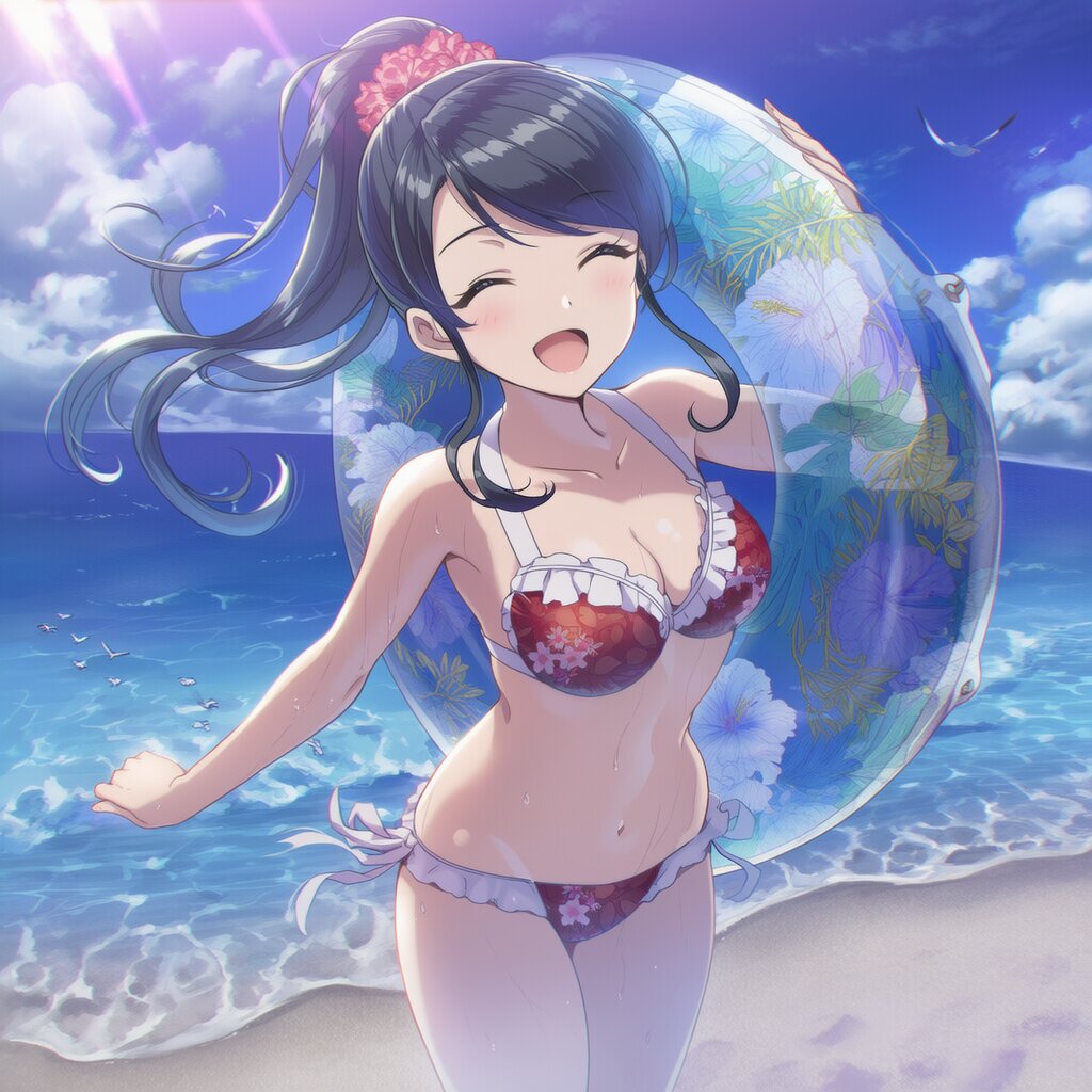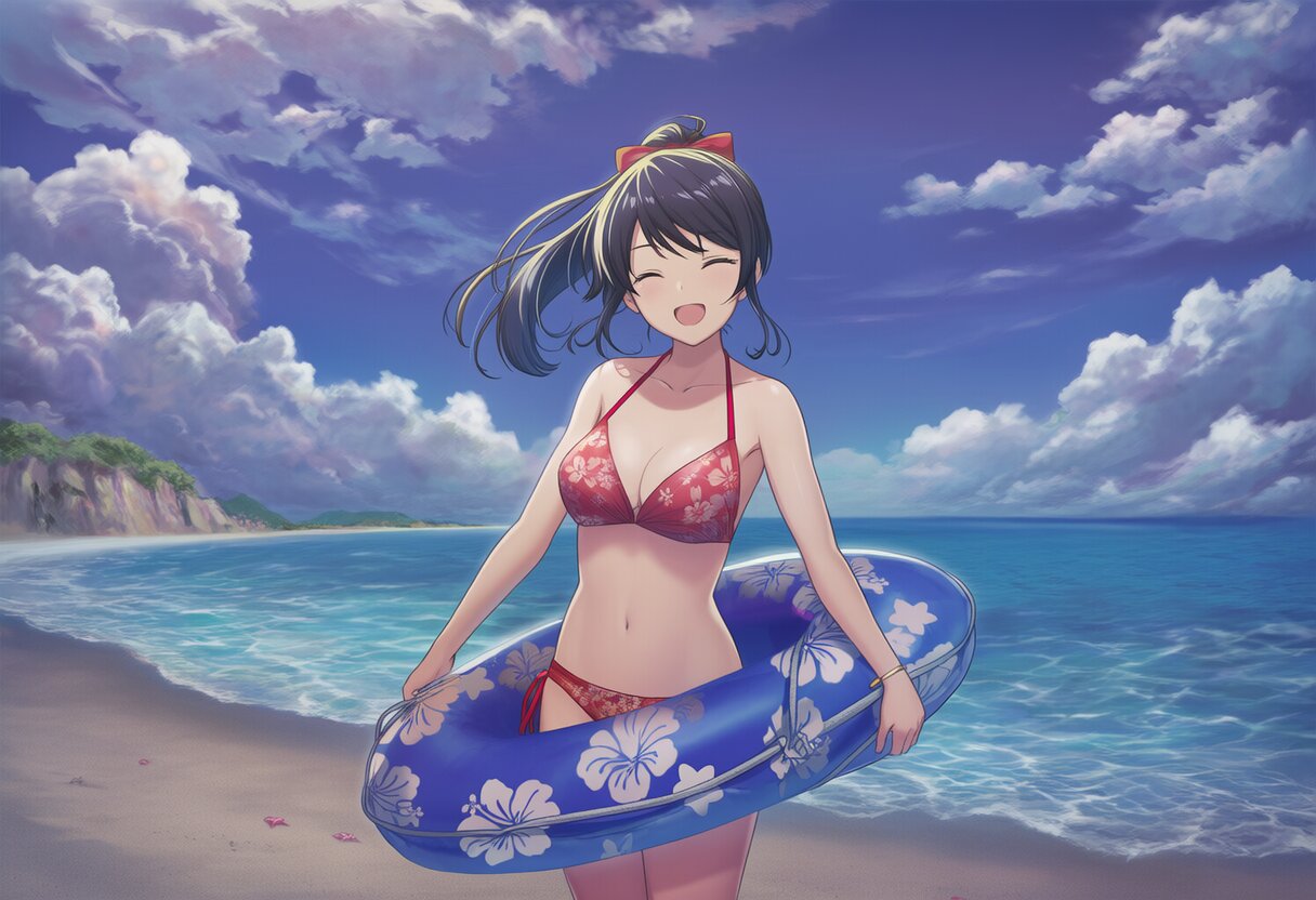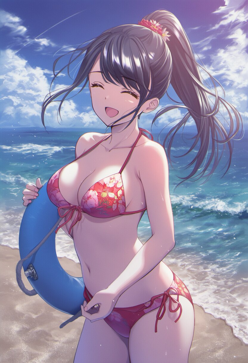 {{{highly detailed}}}, {{official style}}, {100-layer}, {{ultra-high resolution}}, {{{hi-vision anime}}}, {{intricate}}, 1girl, solo, closed eyes, {{{high ponytail, long hair}}}, black hair, swept bangs, medium breasts, open mouth, {{happy}}, {{{holding a ring blue buoy}}}, {{red floral bikini}}, {{{ocean, sandy beach}}}, standing, cowboy shot, {{{masterpiece}}}, {{{best quality}}}, {{{very aesthetic}}}, {{{ultra-detailed}}}, {illustration}, {{{extremely detailed}}}, {{{an extremely delicate and beautiful}}}
