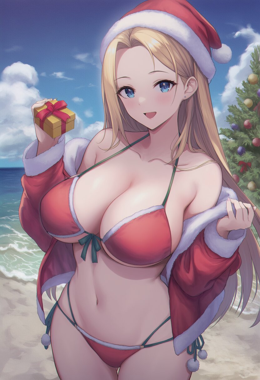 {{{highly detailed}}}, {{official style}}, {100-layer}, {{ultra-high resolution}}, {{{hi-vision anime}}}, {{intricate}}, 1girl, solo, blue eyes, long hair, straight hair, blonde hair, forehead, [[[large breasts]]], smile, happy, open mouth, santa with gift box, santa, santa bikini, santa hat, christmas tree, ocean, sandy beach, blue sky, outdoors, {{{masterpiece}}}, {{{best quality}}}, {{{very aesthetic}}}, {{{ultra-detailed}}}, {illustration}, {{{extremely detailed}}}, {{{an extremely delicate and beautiful}}}