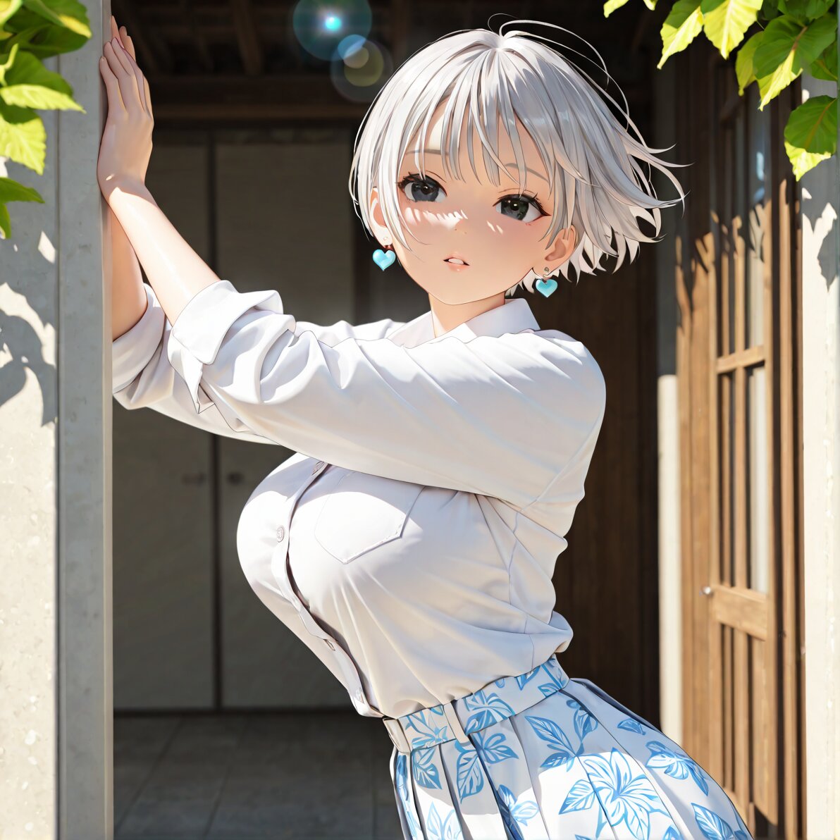 masterpiece, best quality, amazing quality, 4k, very aesthetic, high resolution, ultra-detailed, absurdres, newest, scenery, 3d, rendered, blue glasses 1girl, silver hair, very short hair, choppy bangs, parted lips, T-back, heart-shaped earrings, parted lips, black eyes, standing pose, cowboy shot, glassy eyes, hibiscus flower pattern, large breasts, portrait, dynamic, modern urban renewal area, soft lighting, floating hair, BREAK, hands, fingers, (dappled sunlight, lens flare:1.2), vignetting, dramatic shadow, cinematic lighting, rim light, detailed background, depth of field, vignetting, volumetric lighting
