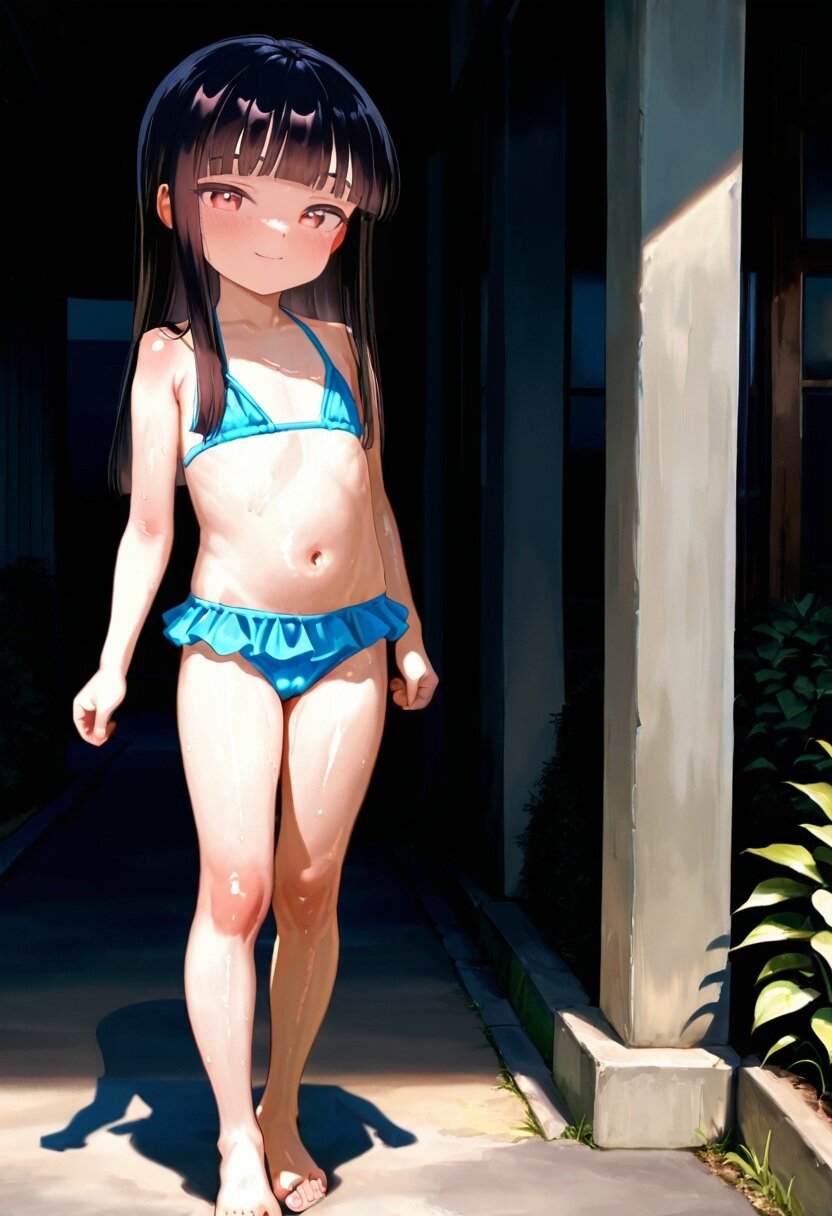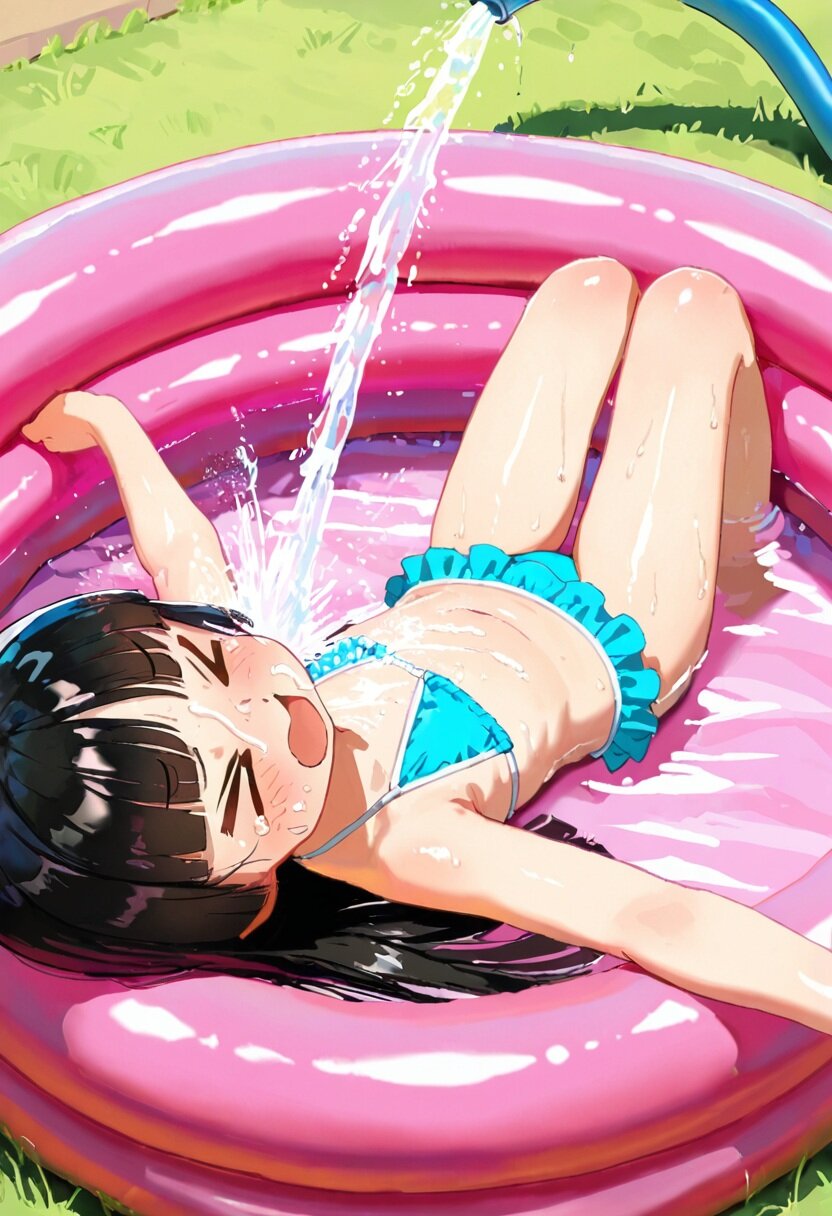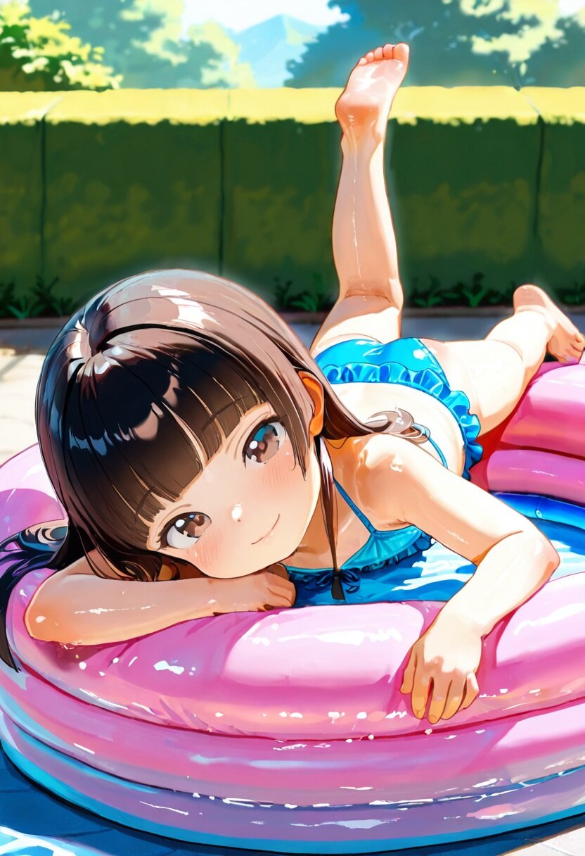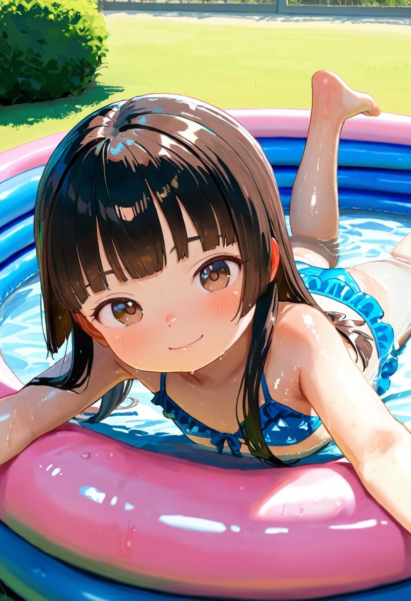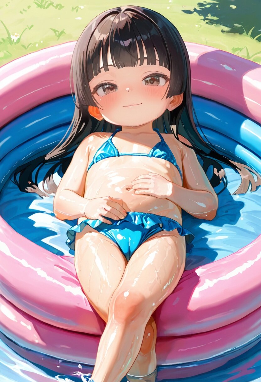 masterpiece,8k,best quality,amazing quality,absurdres, ultra-detailed, very aesthetic, high resolution, newest, detailed shadows, detailed face, detailed skin, shiny skin, intricate details,outdoors,garden, lawn,pink wading pool, BREAK 1girl,(female child, loli, toddler), flat chest, long hair, hime cut, super detailed hair,black hair, turime,dark brown eyes, light smile,standing,on back,lying in pink wading pool ,crossed legs,hand on own stomach, BREAK bikini, blue bikini, frilled swimsuit,triangle bikini,