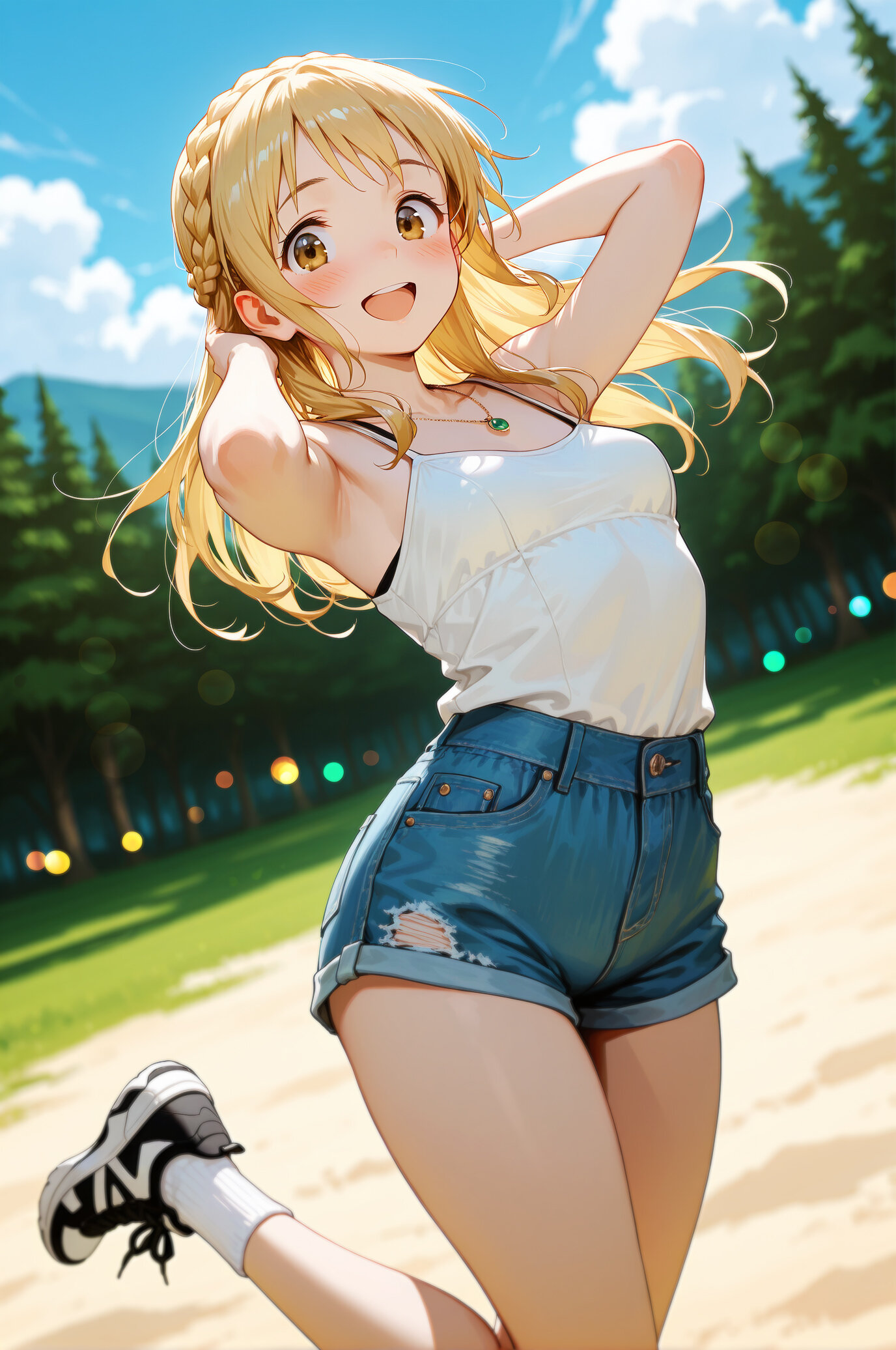 masterpiece, best quality, absurdres, 8k, ultra detailed, aesthetic, very aesthetic, newest, <lora:Fixhands_anime_bdsqlsz_V1:0.5>, <lora:bold-16oa:-0.5>, (realistic:0.3),BREAK (bokeh,shallow depth of field,Gaussian Blur:1.6),(lens flare:1.3), summer,cloud,outdoors,blue sky,(camp:1.1),(smile,happy,dynamic pose:1.3),blush, 1girl,mature female,(madium breasts:1.4),(long hair,blonde hair, crown braid:1.2),(happy,looking at viewer:1.3),open mouth,blush,curvy,,(casual clothes,sneakers,shorts,white socks,sneakers,necklace:1.2),(beautiful brown eyes:1.1),(teen, cute,tareme:1.3),,open mouth,(cowboy shot,from front,wide angle,wide shot:1.3),from front,(small breasts,curvy :1.3)<lora:USNR STYLE_XL_loha:0.8>