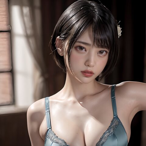 (cowboy shot, from above: 1.6), (8k, best quality, masterpiece:1.4), (realistic, photo-realistic:1.6), HDR, (incredibly absurdres:1.2), (vibrant color:1.2), ultra-detailed, 1girl, solo, 18years old, boyish, dance queen, (slender, medium breasts: 1.8), (very short hair: 1.8), perfect body, highly detailed, shiny hair, looking at viewer, (Camisola Lingerie Nighty Wedding Silk Dress, red panties: 1.2), (lifting the breasts with arms: 1.2), (sitting on floor: 1.4), in the night pub, <lora:hibi_v01:0.8>