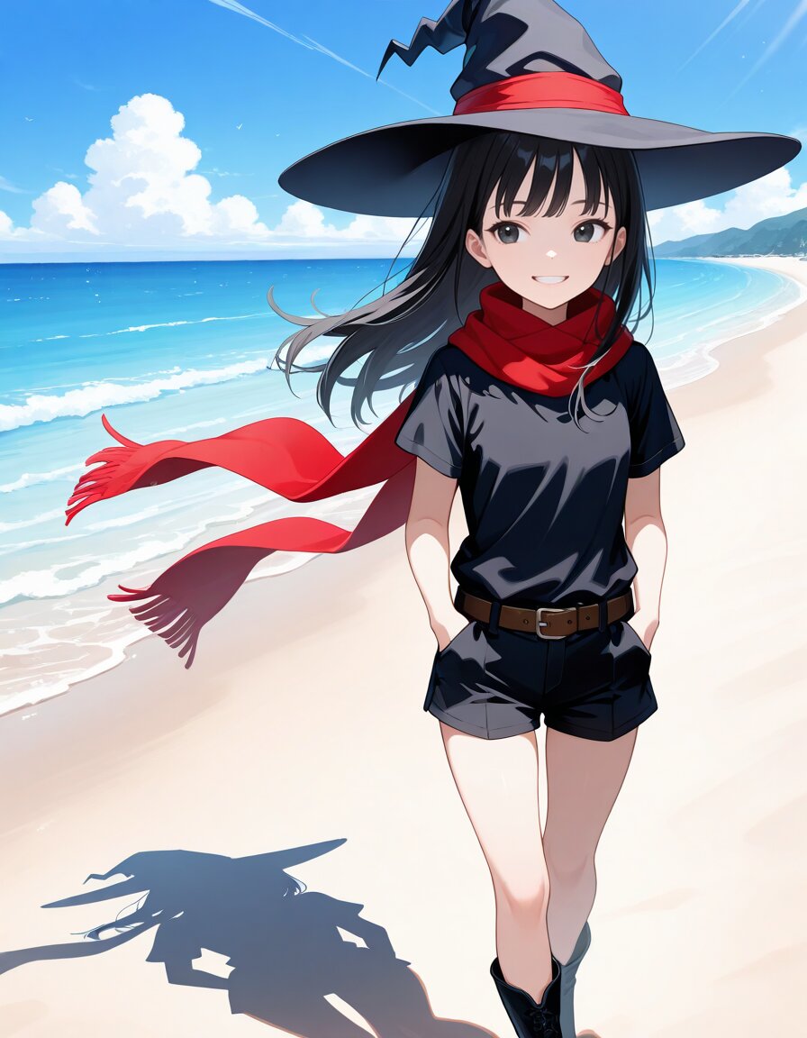 masterpiece,best quality,highres,highly detailed,general,1girl,solo,17yo,(hands in pockets, black witch hat,long red scarf,grin),cute girl,slender,small breasts,short sleeves,light smile,black hair,long hair,bangs,black eyes,Witch girl,(black shirt,long black shorts),belt,short boots,slender girl,walking,beach,sea,summer,blue sky,wind,fantasy,