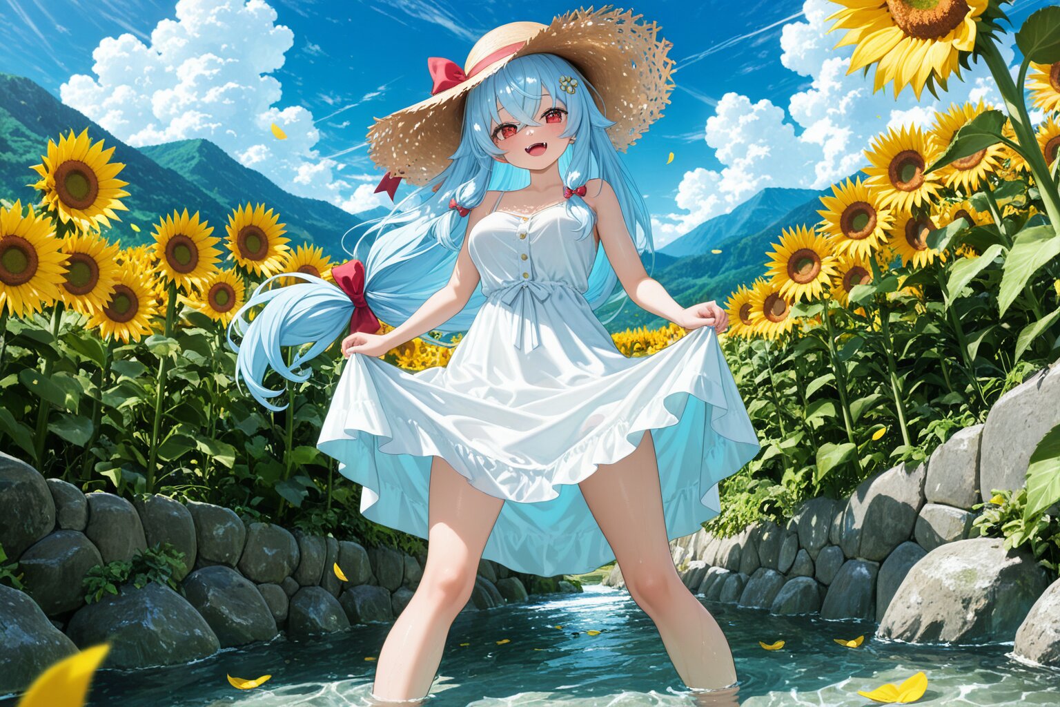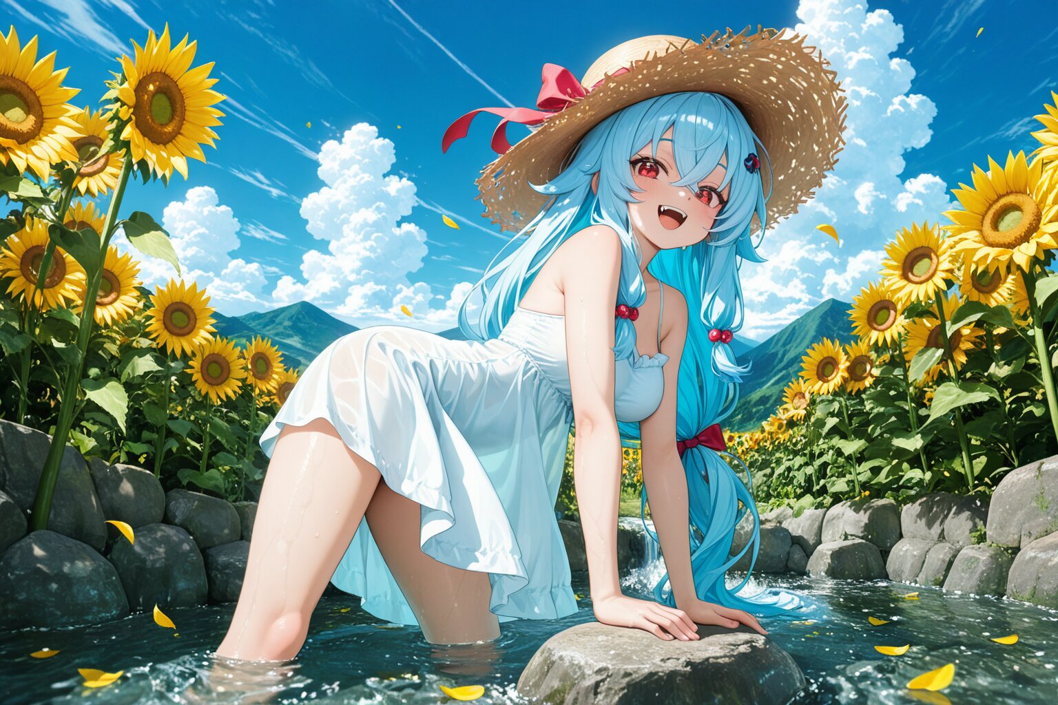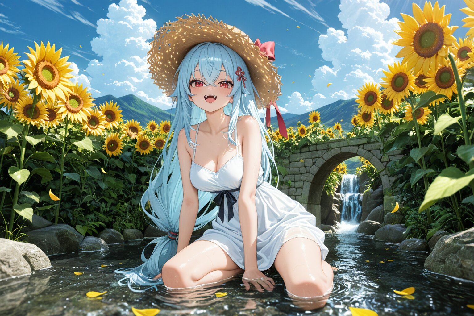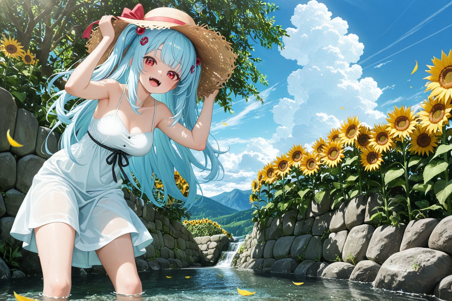 masterpiece, best quality, amazing quality, 8k, very aesthetic, high resolution, ultra-detailed, absurdres, newest, scenery, anime_style, kawaii, cute, summer, 1girl, solo, medium breasts, light blue hair, low-tied long hair, red eyes, crossed bangs, happy, fangs, open mouth, straw hat, hat ribbon, hair ornament, ribbon, white dress, blue sky, (Cumulonimbus cloud), mountainous horizon, nature, sunflower field, stream, (shallow water), Stone Wall, bridge, climbing plant, (petals), from below, looking at viewer,