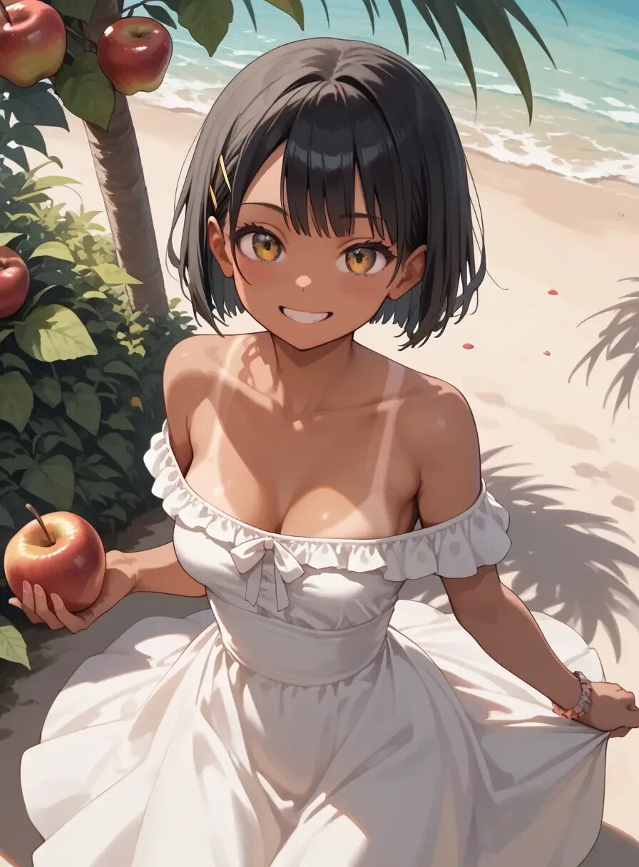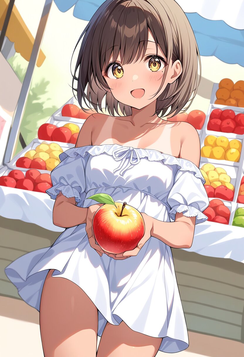 White off-shoulder dress, girl holding three apples on dress with hands in front of her, tan lines, tanned skin, open chest, sunny, summer, fruit stall in background, angle from slightly above, chest_Focus, open-mouthed smile, light blush,