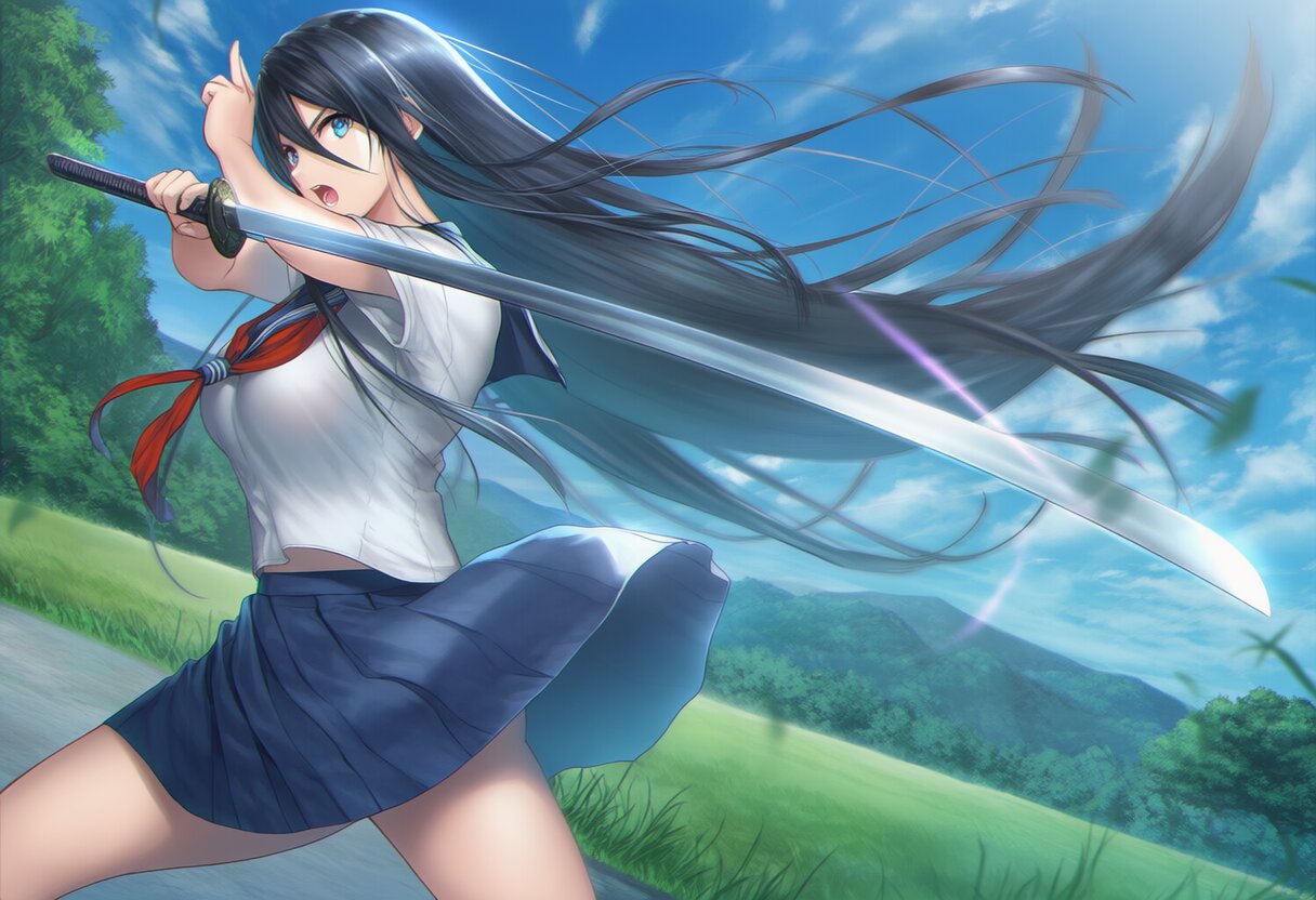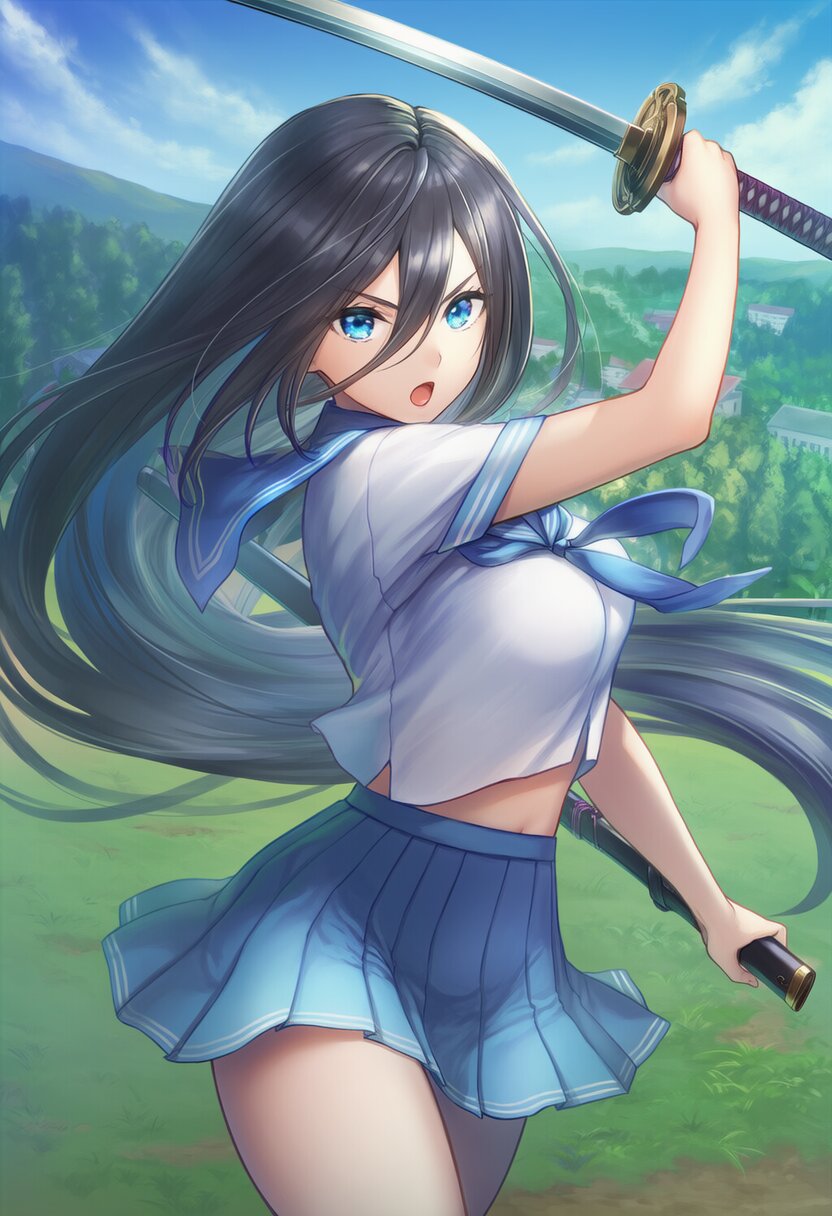 {{{highly detailed}}}, {{official style}}, {{game cg}}, {{intricate}}, {{slender}}, {{tenka hyakken}}, 1girl, solo, blue eyes, very long hair, black hair, hair between eyes, [[[large breasts]]], serious, open mouth, {{{white sailor suit, short sleeves, blue skirt}}}, school, grassland, trees, blue sky, cowboy shot, {{{swordsmanship, battle, acrobatic movement, holding a katana, sword swinging}}}, {{{masterpiece}}}, {{{best quality}}}, {{{very aesthetic}}}, {{{ultra-detailed}}}, {illustration}, {{{extremely detailed}}}, {{{an extremely delicate and beautiful}}}