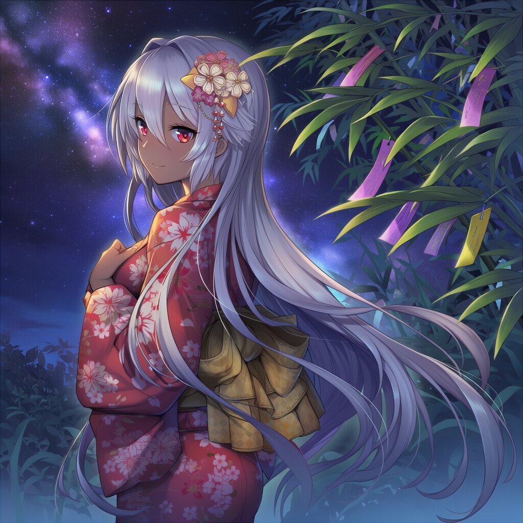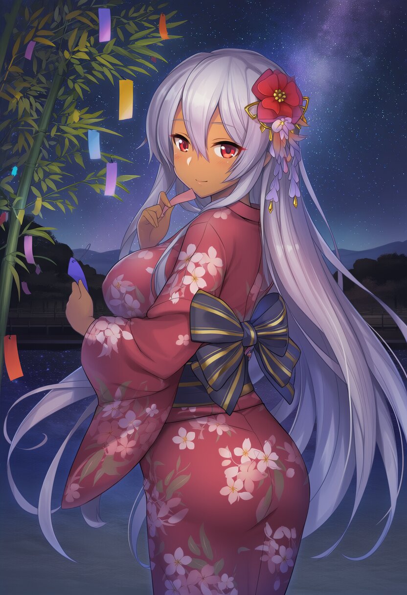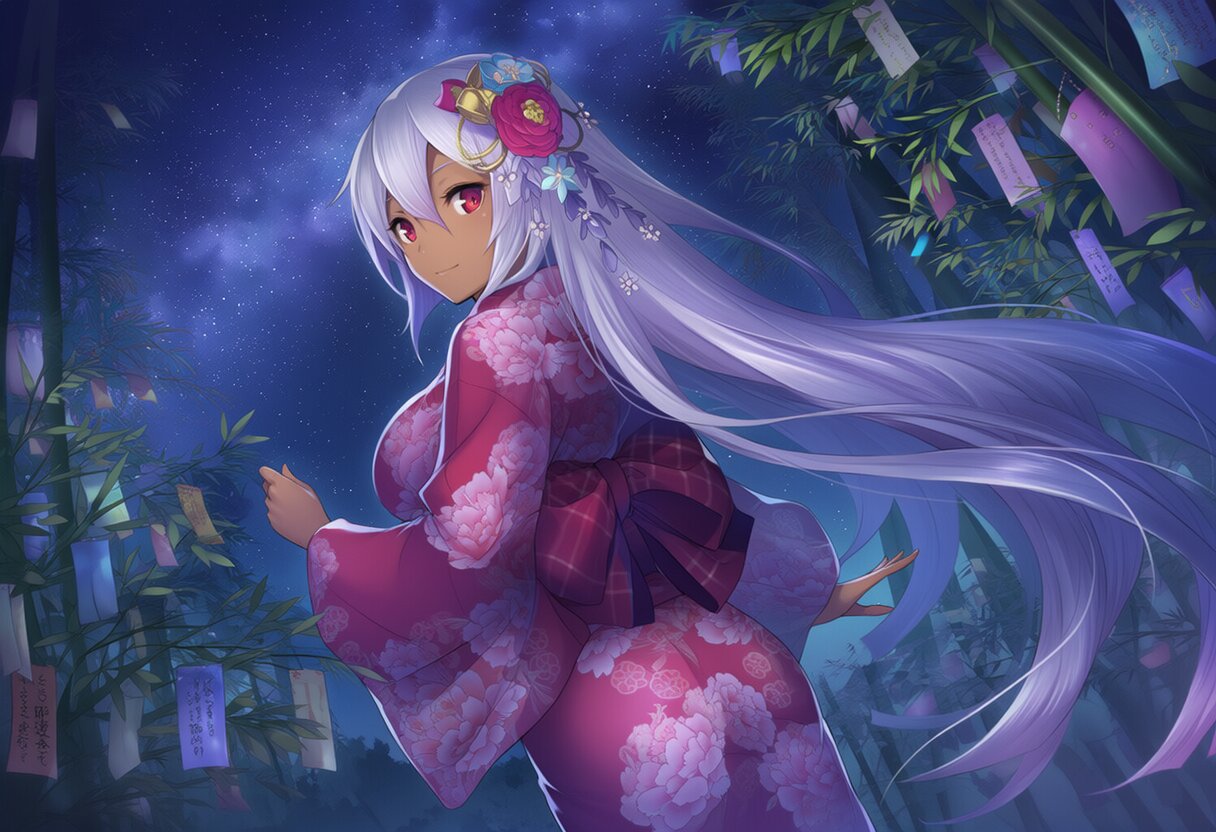 {{{highly detailed}}}, {{official style}}, {{game cg}}, {{intricate}}, {{slender}}, {{houchi shoujo}}, 1girl, solo, red eyes, very long hair, white hair, hair between eyes, dark skin, [[[large breasts]]], {{light smile}}, {{red flower-patterned yukata}}, looking back, standing, cowboy shot, milky way, {{{{bamboo thicket, tanabata}}}}, night, hight decorated, decorations, childhood memory, paper decoration, decorated ornaments, shiny, {{{masterpiece}}}, {{{best quality}}}, {{{very aesthetic}}}, {{{ultra-detailed}}}, {illustration}, {{{extremely detailed}}}, {{{an extremely delicate and beautiful}}}