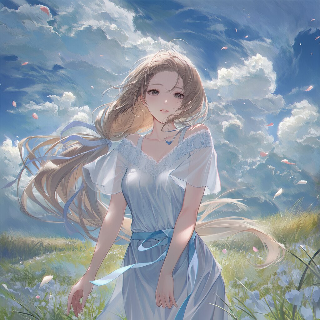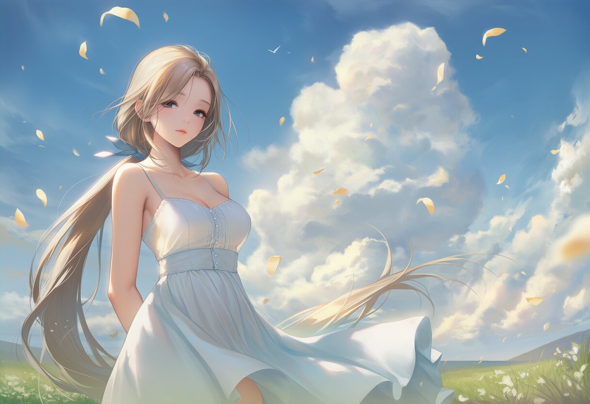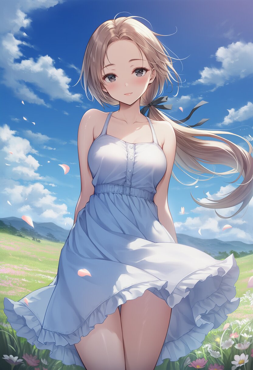 {{high resolution}}, {{perfect anatomy}}, {{super detailed skin}}, {{ultra detailed skinfantasy illustration}}, {{{{summer sky, summer}}}}, 1girl, solo, very long hair, {{low ponytail}}, wavy hair, forehead, light brown hair, hair ribbon, black eyes, sleeping, medium breasts, standing, grasslands, blue sky, {{{{{wind, petals}}}}}, cowboy shot, {{{masterpiece}}}, {{{best quality}}}, {{{very aesthetic}}}, {{{ultra-detailed}}}, {illustration}, {{{extremely detailed}}}, {{{an extremely delicate and beautiful}}}