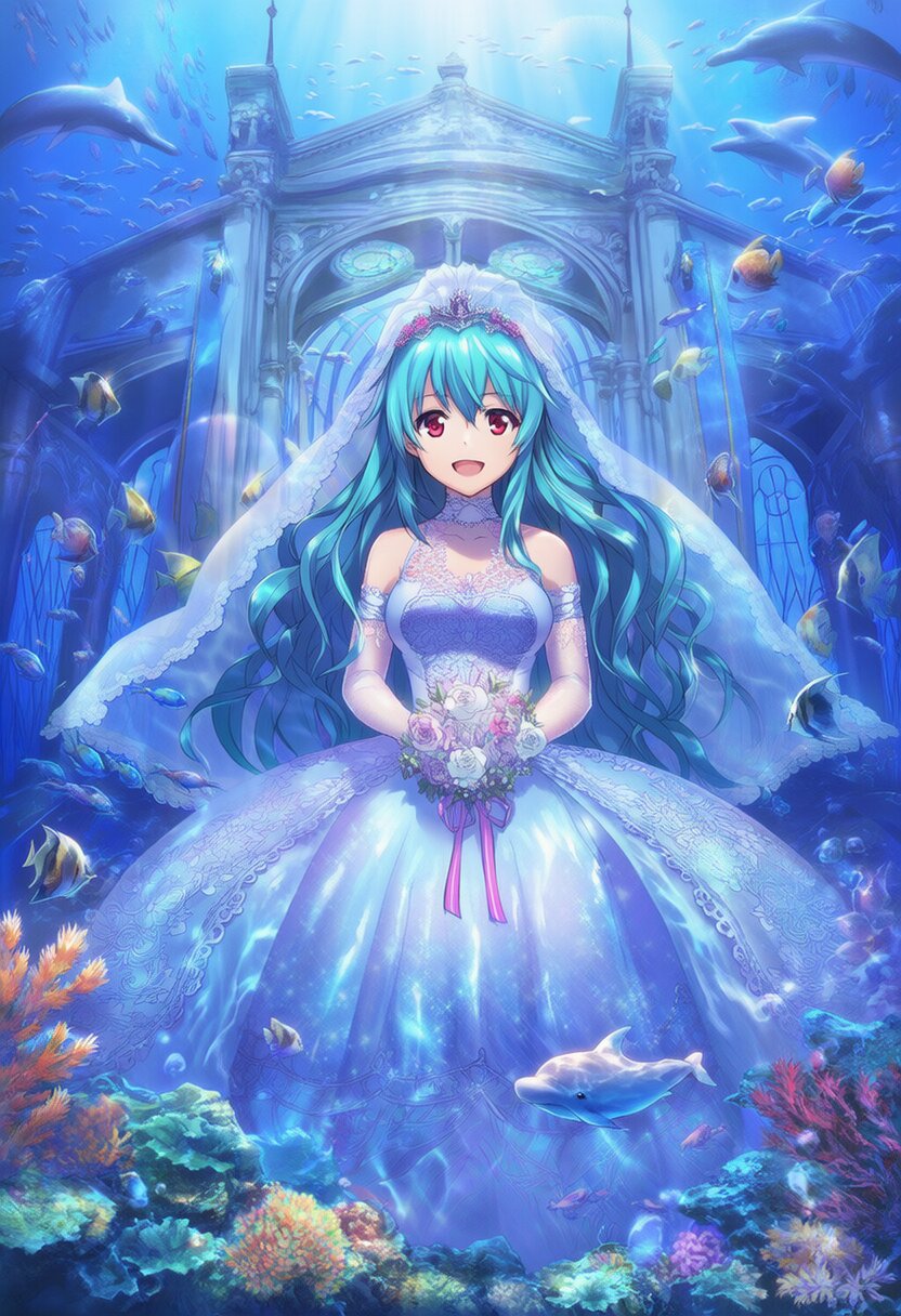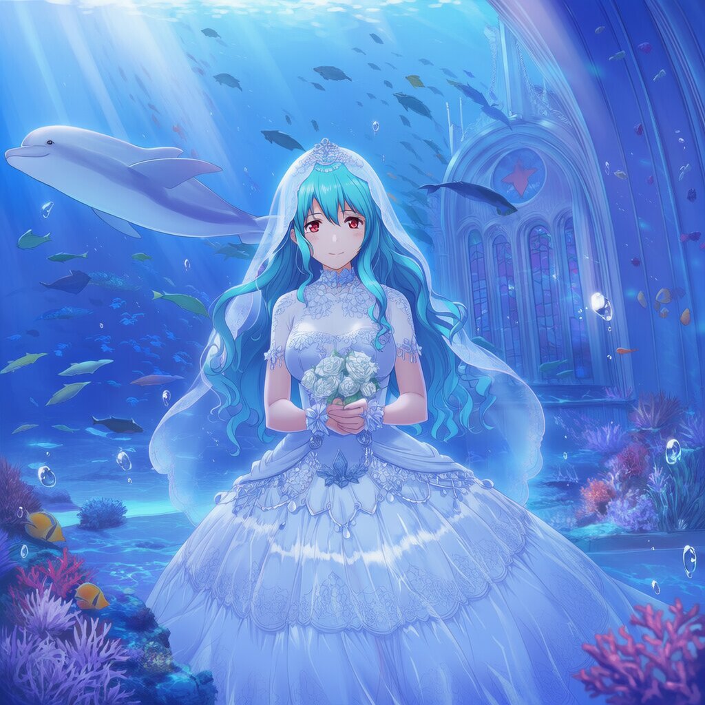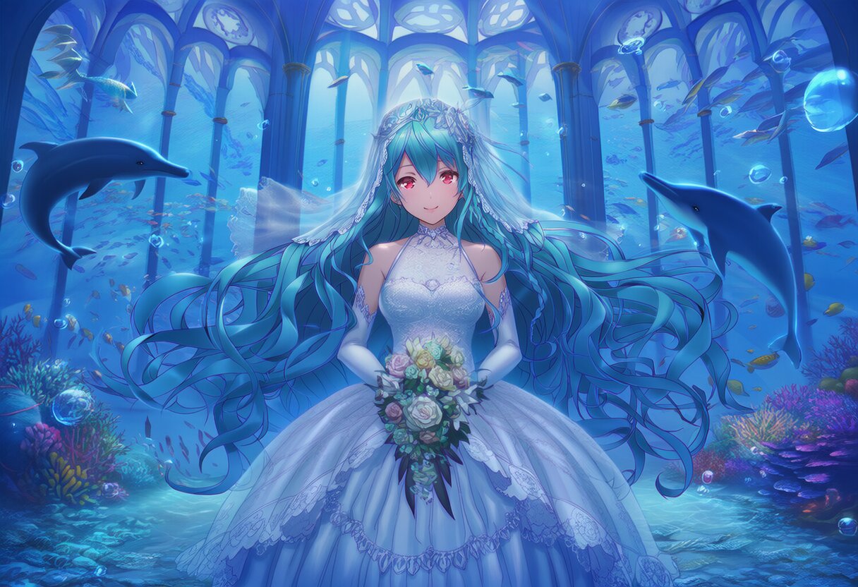 {{{highly detailed}}}, {{official style}}, {100-layer}, {{ultra-high resolution}}, {{{hi-vision anime}}}, {{intricate}}, 1girl, solo, aqua hair, very long heir, {{{wavy hair}}}, hair between eyes, red eyes, happy, medium breasts, {{{{{{dolphins}}}}}}, {{{coral reef}}}, [[[school of fish]]], underwater, indoor, cowboy shot, wedding veil, water dress, wedding princess dress, light ray, lens flare, bubble, exotic, bride, marriage, beautifully dressed, shiny clothes, lace on clothes, clothes lace, large skirt, lace trim, stand posture, facing the front there, flowers in hand, light yarn, church, no animal, {{{masterpiece}}}, {{{best quality}}}, {{{very aesthetic}}}, {{{ultra-detailed}}}, {illustration}, {{{extremely detailed}}}, {{{an extremely delicate and beautiful}}}