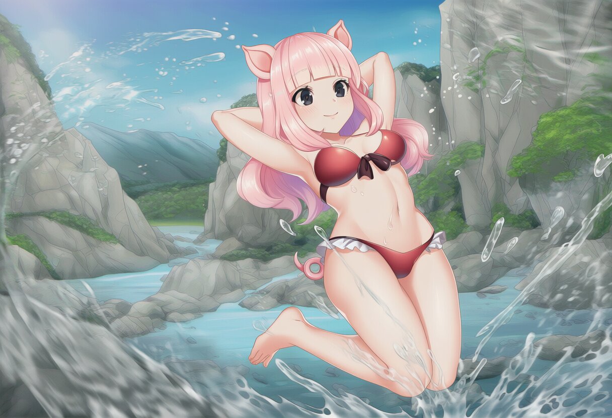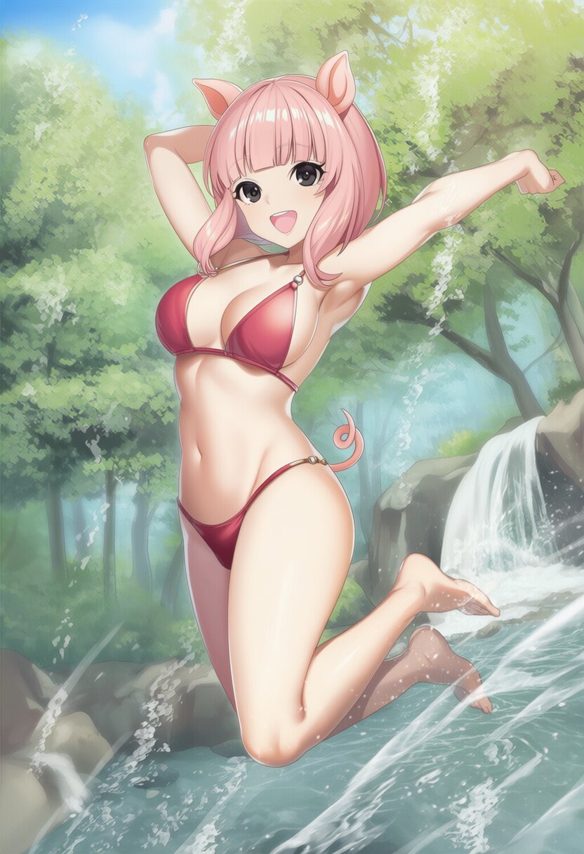 {{{highly detailed}}}, {{official style}}, {{game cg}}, {{intricate}}, {{nijigen kanojo}}, {{slender}}, {{{detailed beautiful eyes, detailed beautiful face, detailed beautiful face and eyes}}}, 1girl, solo, black eyes, {{happy, light smile}}, pink hair, {{{pig's ear, pig tail, pig girl, animal girl}}}, medium hair, shiny hair, blunt bangs, medium breasts, {{{{{{red bikini}}}}}}, {{{sheet of spray}}}, {{arms up, jumping}}, trees, rivers, rocky areas, {{{masterpiece}}}, {{{best quality}}}, {{{very aesthetic}}}, {{{ultra-detailed}}}, {illustration}, {{{extremely detailed}}}, {{{an extremely delicate and beautiful}}}