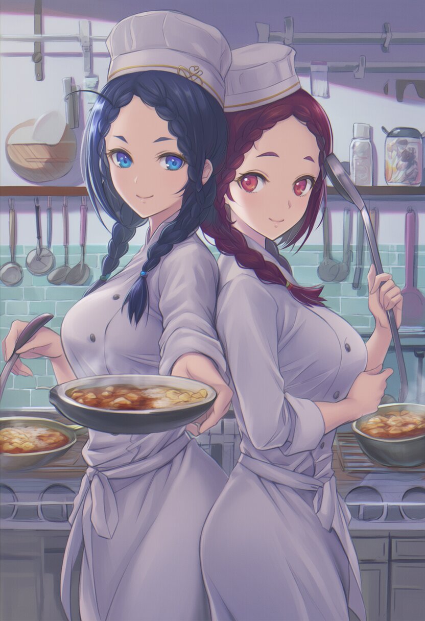 キャラクター 2 プロンプト: girl, red eyes, medium hair, dark red hair, twintails, forehead, multiple braids, large breasts, {{smile}}, {{{cook's uniform, white uniform, cook's hat}}}