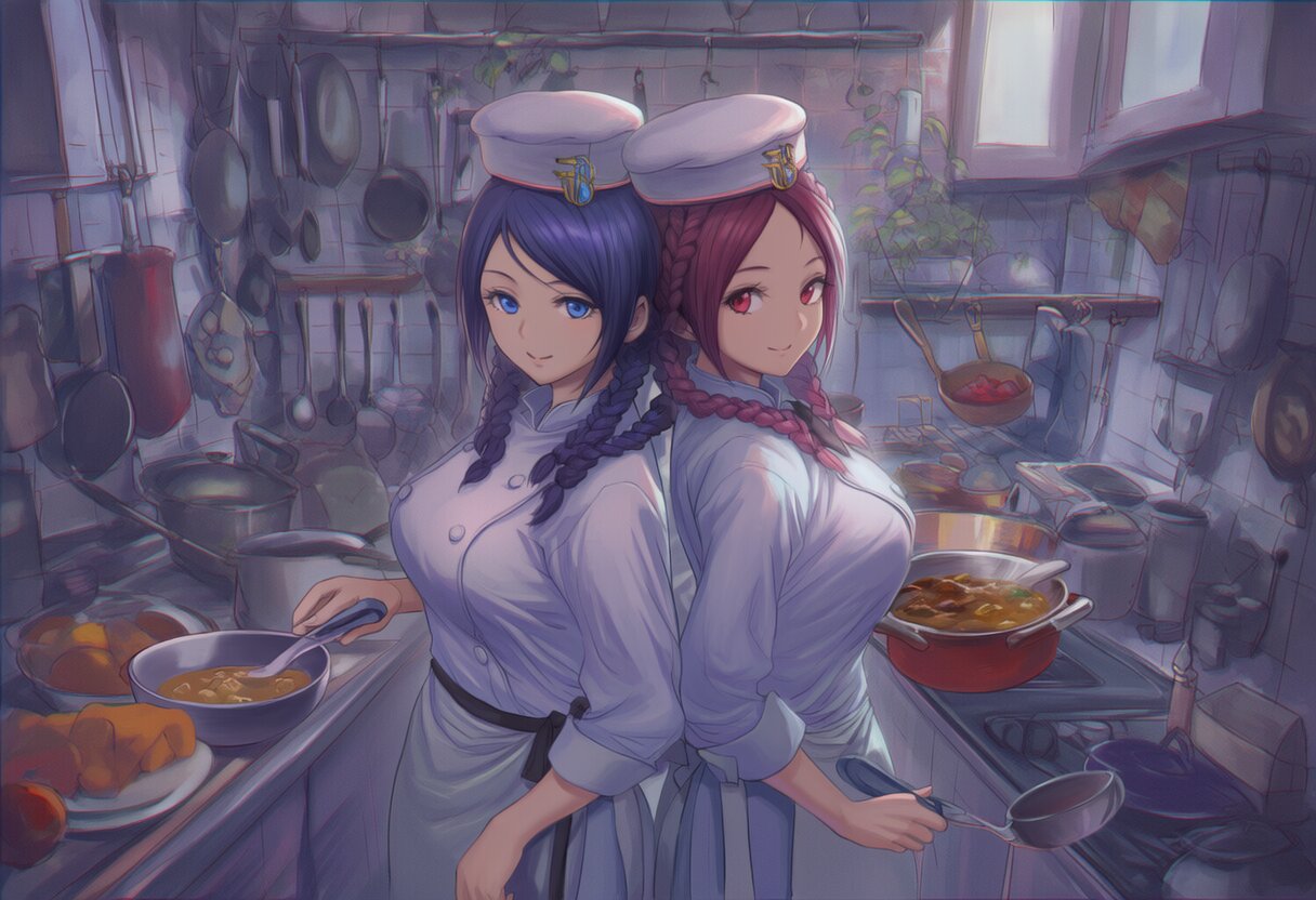 {{{highly detailed}}}, {{official style}}, {100-layer}, {{{{ultra-high resolution}}}}, {{{hi-vision anime}}}, {{intricate}}, {{{detailed beautiful eyes, detailed beautiful face, detailed beautiful face and eyes}}}, {{{{{2girl's, gemini, back-to-back}}}}}, cowboy shot, standing, {{kitchen}}, hold a ladle, make curry, {{{{deep bottomed pots and pans}}}}, {{{masterpiece}}}, {{{best quality}}}, {{{very aesthetic}}}, {{{ultra-detailed}}}, {illustration}, {{{extremely detailed}}}, {{{an extremely delicate and beautiful}}}