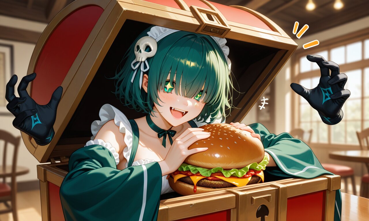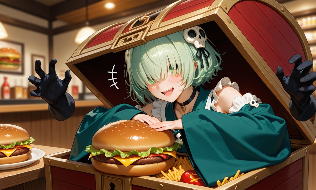 sharp focus, (background is fastfood restaurant, food coat, indoors), hands holding a Big hamburger, splash ketchup, cobalt green hair, short hair, messy hair, (hair over eyes:1.2), green eyes, demon fangs, +_+, open mouch, smile, cheerful, +++, notice lines, choker, green wa maid outfit, (oversized sleeves:1.2), detached sleeves, (floating black ghosty hands:1.2), skull hair ornament, in mimic chest, ultra detailed lips, ultra detailed face and hair, beautiful eyes,, score_9, score_8_up, score_7_up, masterpiece, amazing quality, very aesthetic, high resolution, ultra-detailed, absolute, newest, 2d, semi-realistic, moe heroine, sharp focus,, anime style, anime color, anime artwork, anime, cel anime, flat color,