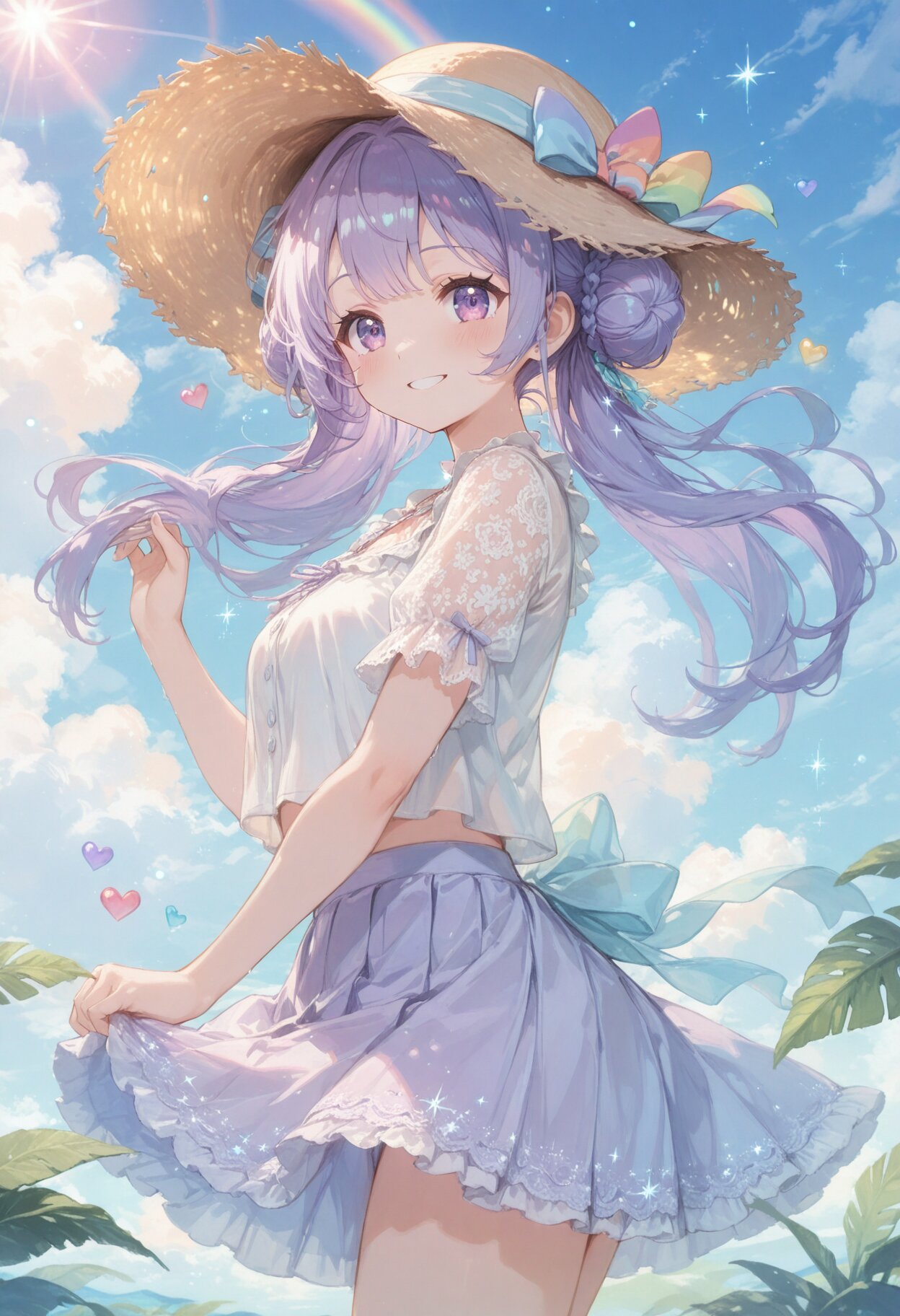 (masterpiece:1.2),best quality,amazing quality,very aesthetic,absurdres,highres,newest,HDR,8K,high detail,colorful,solo, upper body, cute anime girl with a cheerful smile, light summer outfit, flowing short-sleeve white blouse with lace sleeves, pastel lavender flared skirt with soft pleats, soft frill details, soft sunlight, long silky purple hair with vivid light blue inner highlights styled in twin buns with loose side hair, sparkling purple eyes, wearing a straw hat with pastel ribbon, hair and skirt swaying in the breeze, holding her hat with one hand, standing under a bright blue summer sky with white clouds, fresh green leaves in background, subtle sparkles and warm summer glow, soft pastel color palette, dreamy watercolor texture, thin delicate lineart, translucent accents, fluffy lighting, magical gentle atmosphere, cinematic moment, masterpiece, best quality, soft pastel color palette, thin delicate lineart, pale colors, watercolor texture, matte finish, subtle shading, minimal contrast,, pastel color palette, soft glow, sparkles, floating petals, fluffy textures, star motifs, heart motifs, translucent fabric, soft frills, magical atmosphere, gentle light, dreamy background, faint clouds, cute accessories, subtle rainbow tones