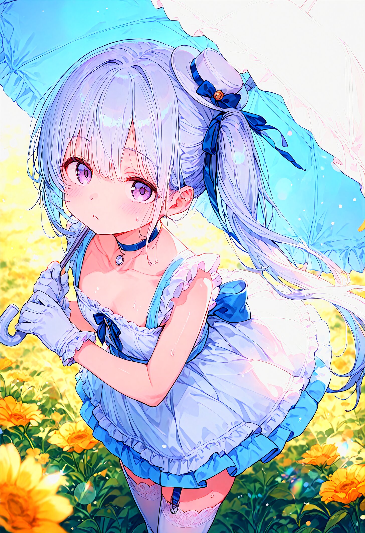 beautiful detailed background, best quality, (pale color:0.9), depth of field, (lens flare,,:1.2) sunlight, (backlighting,:0.8) 1girl, collarbone,, parted lips,(Expressionless:0.8), big eyes,(half-closed eyes:0.8), tareme, pale purple eyes, thighhighs, (silver hair:1.1), (dark blue hair colored inner hair:0.8), long hair,very long hair,side ponytail, eyebrows visible through hair, parasol,, holding,holding parasol,, white parasol, mini hat, blue strapping ribbon and bow, frills, strapping ribbon, choker, sweat, white and blue casual dress, white gloves, gloves, looking at viewer, standing, garter straps, sun flower field,, from above, <lora:sdxl-shadow_01:-0.8> <lora:noline-16oa:-0.5> <lora:sdxl2-flat2-512b:-1.3>