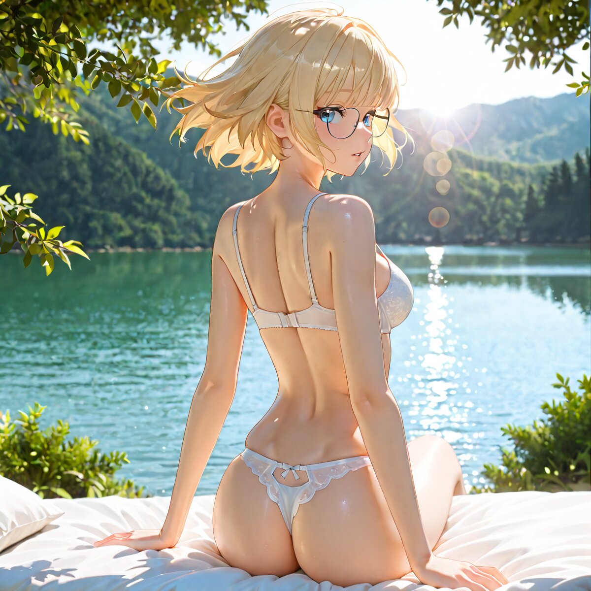 masterpiece, best quality, amazing quality, 4k, very aesthetic, high resolution, ultra-detailed, absurdres, newest, scenery, 3d, rendered, 1girl, solo, glasses, blonde hair, short hair, choppy bangs, parted lips, blue eyes, full-coverage bra, white thong panties, medium breasts, back view, look at viewer, dynamic, lake, soft lighting, floating hair, BREAK, hands, fingers, (dappled sunlight, lens flare:1.2), vignetting, dramatic shadow, cinematic lighting, rim light, detailed background, depth of field, vignetting, volumetric lighting