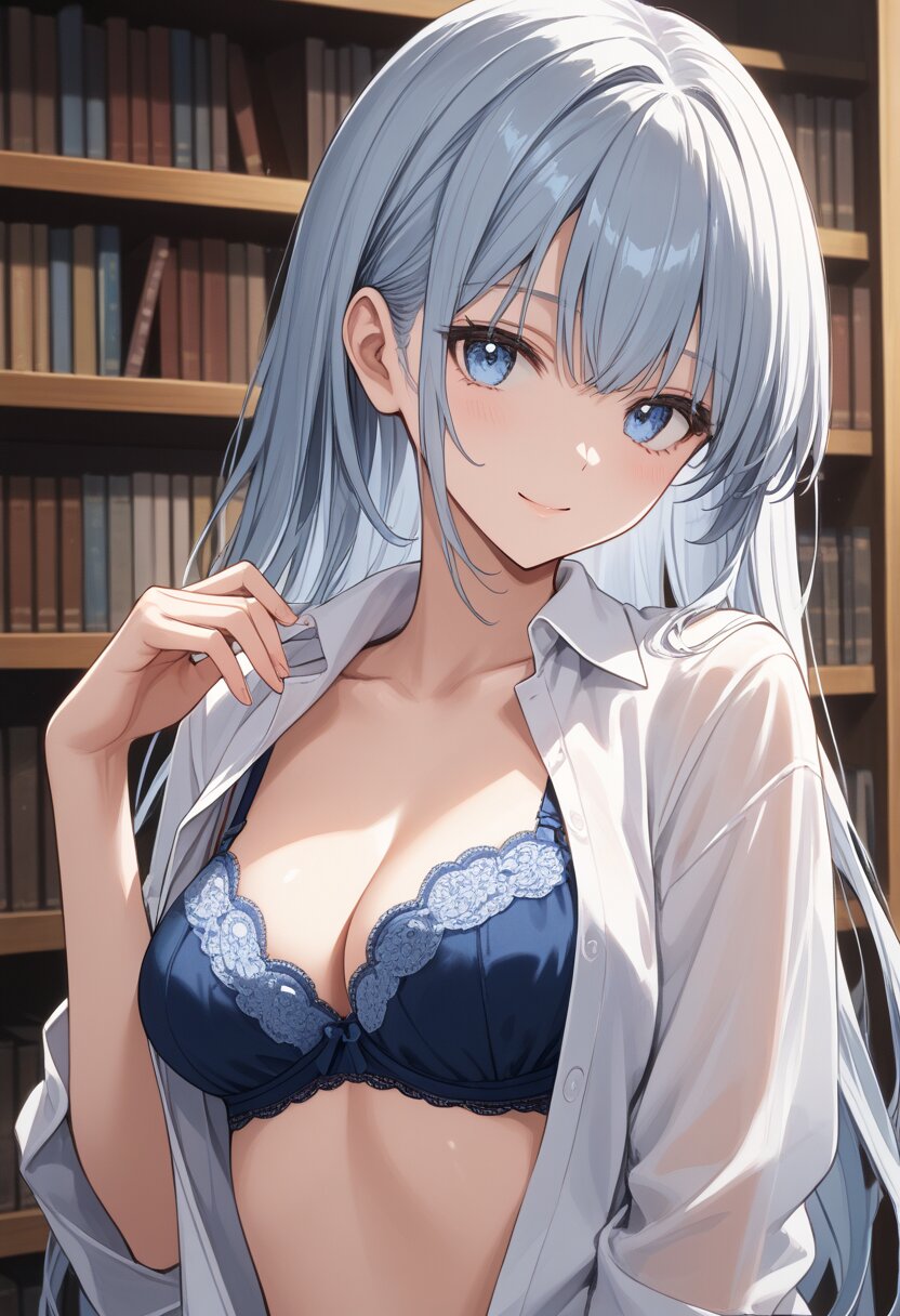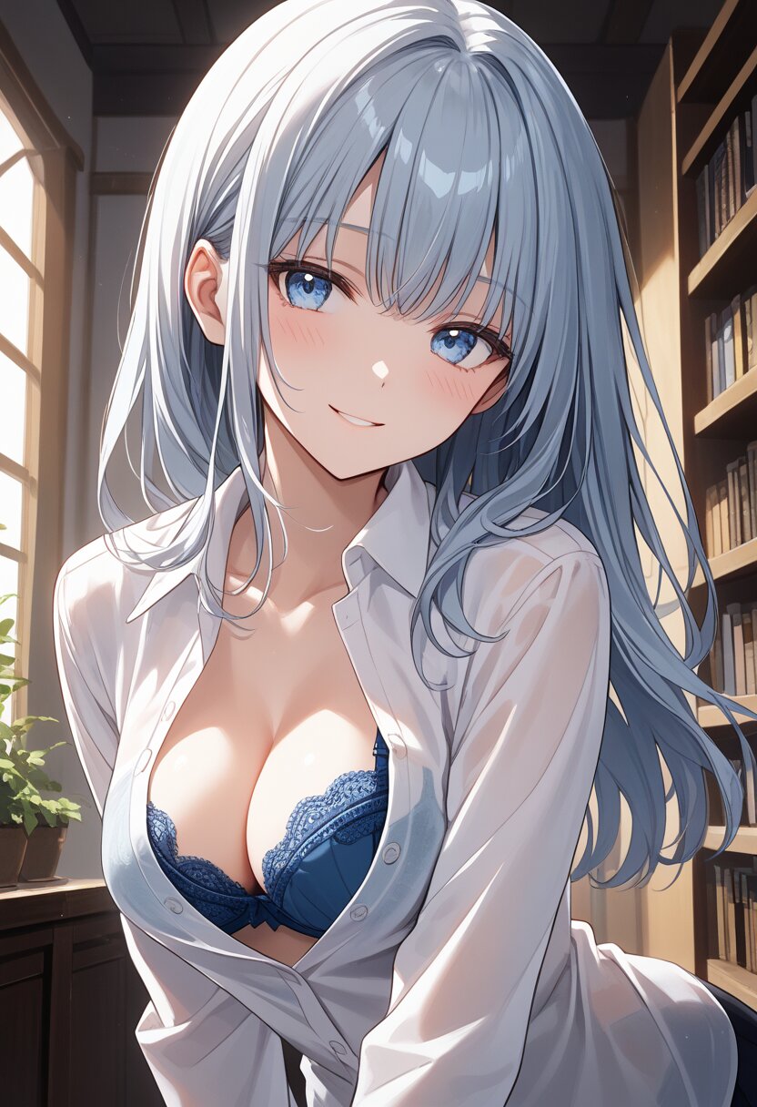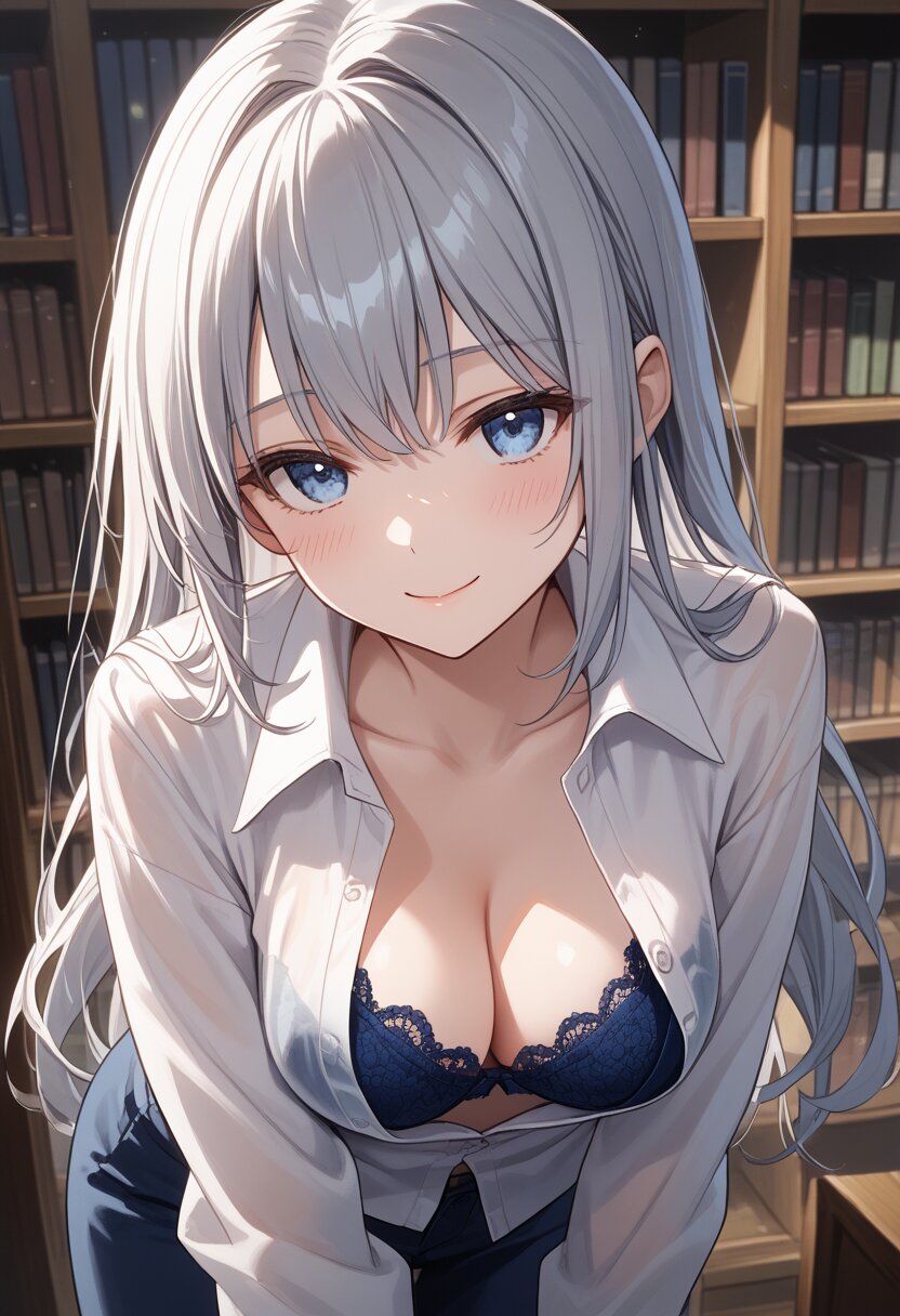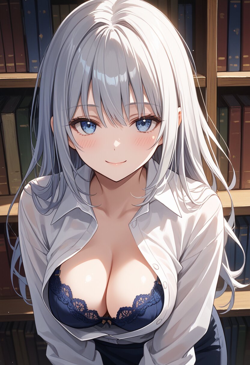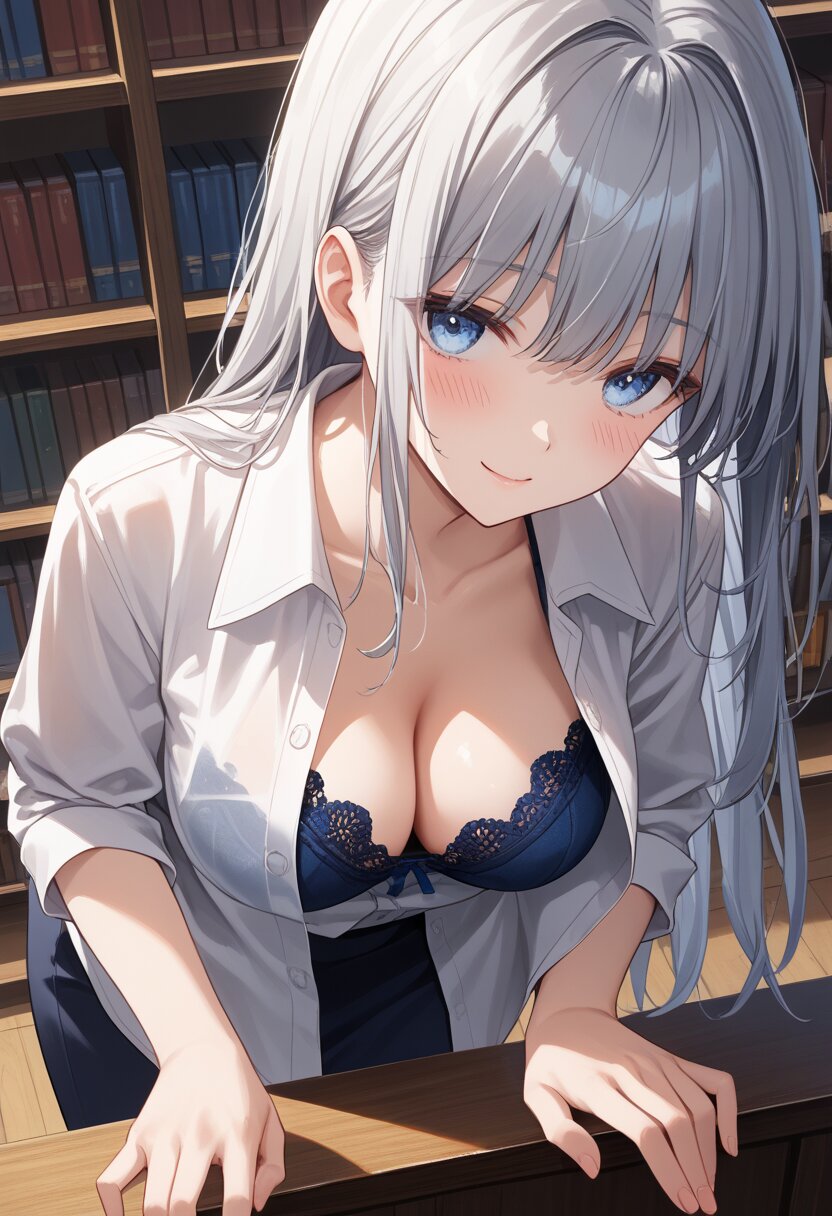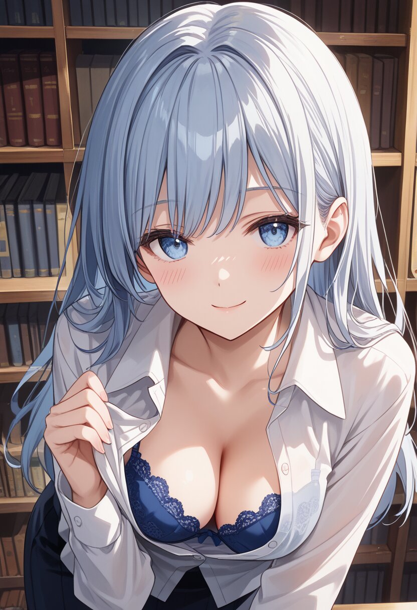 score_9,score_8_up,score_7_up,source anime,best quality,masterpiece,8k,extremely detailed CG unity 8k wallpaper,(close-up:1.2),dynamic_angle,(bookshelf:0.9),(depth of field:0.8),light blue eyes,bishoujo,1girl,bangs,medium breasts,silver long hair,(opened white shirt with hands:1.3),see-through collared shirt,(dark-blue bra with lace:1.2),(looking_at_viewer:1.1),(seductive_smile:1.1),(big breasts:0.8),(breasts_focus:1.2),leaning_forward,blush,shirt_tug,partially_unbuttoned,