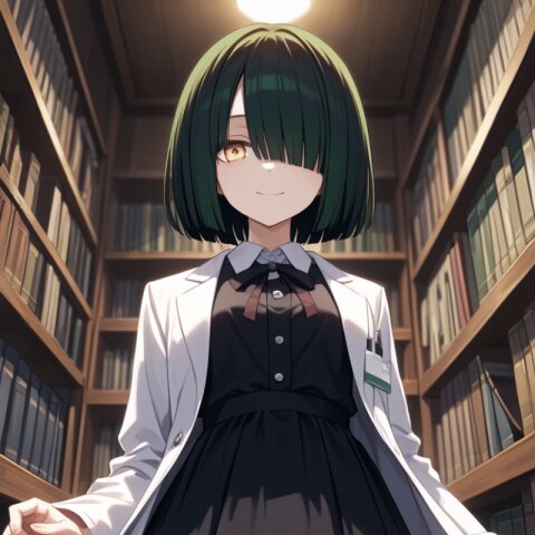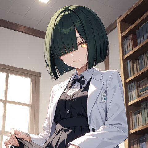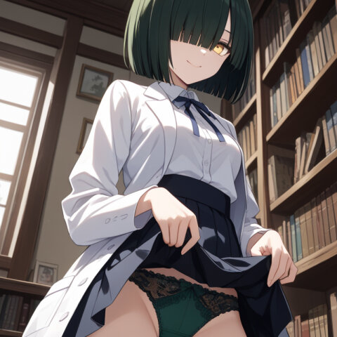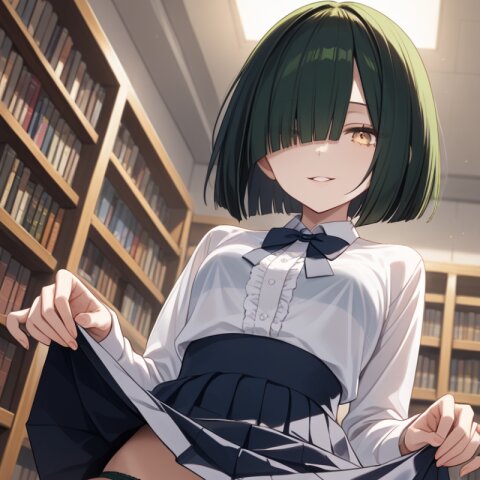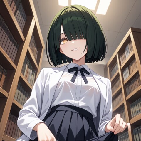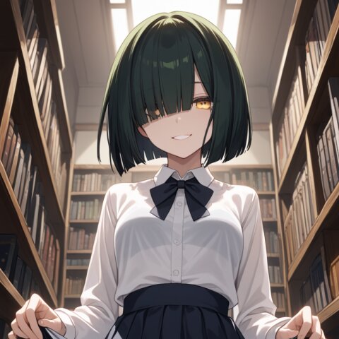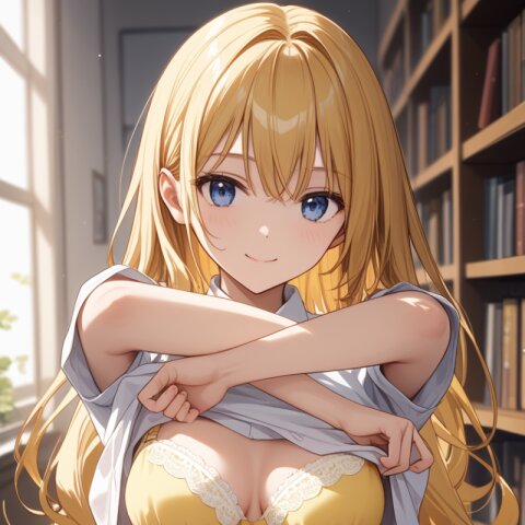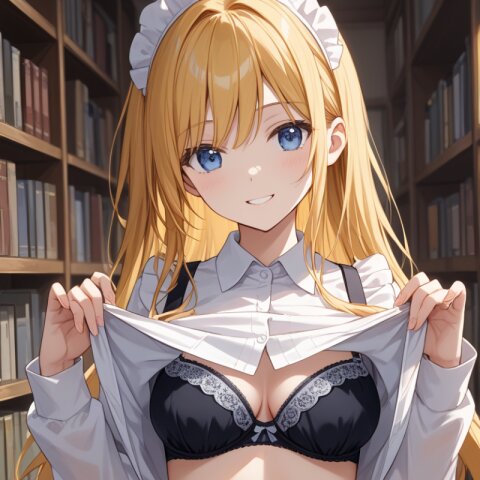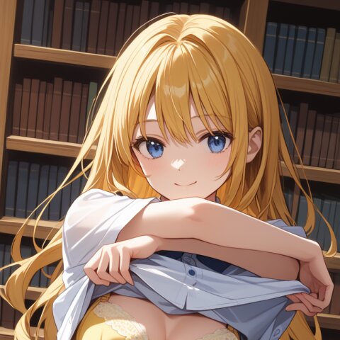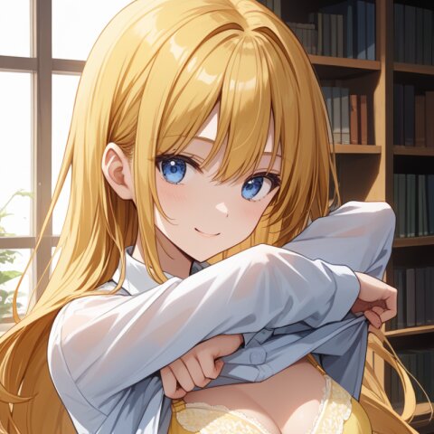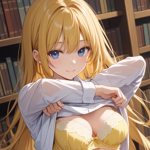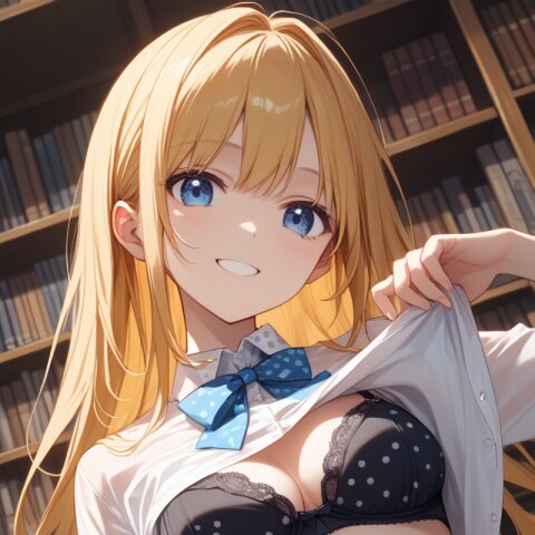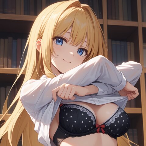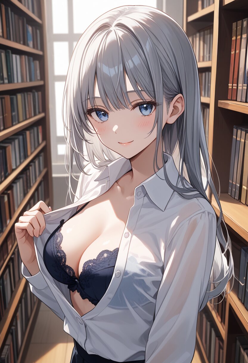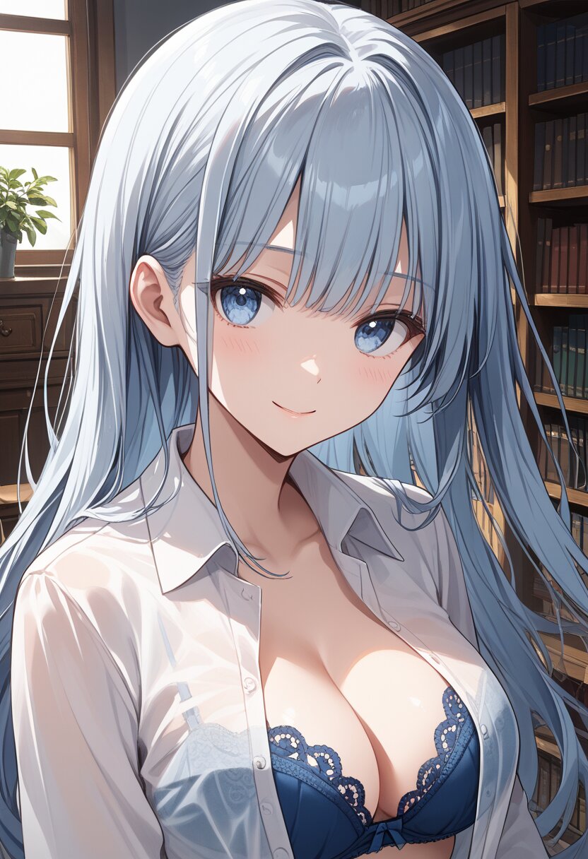 score_9,score_8_up,score_7_up,source anime,best quality,masterpiece,8k,extremely detailed CG unity 8k wallpaper,(close-up:1.2),dynamic_angle,(bookshelf:0.9),(depth of field:0.8),light blue eyes,bishoujo,1girl,bangs,medium breasts,silver long hair,(opened white shirt with hands:1.3),see-through collared shirt,(dark-blue bra with lace:1.2),(looking_at_viewer:1.1),(seductive_smile:1.1),(big breasts:0.8),(breasts_focus:1.2),leaning_forward,blush,shirt_tug,partially_unbuttoned,