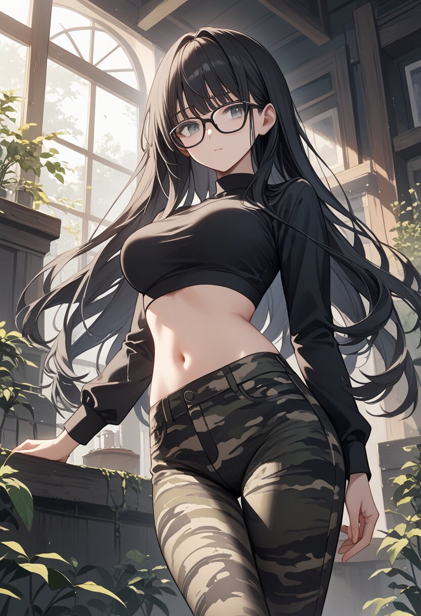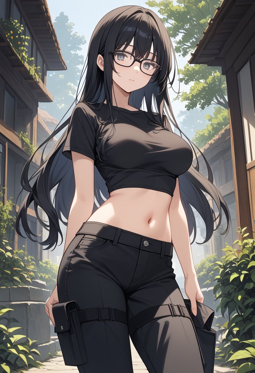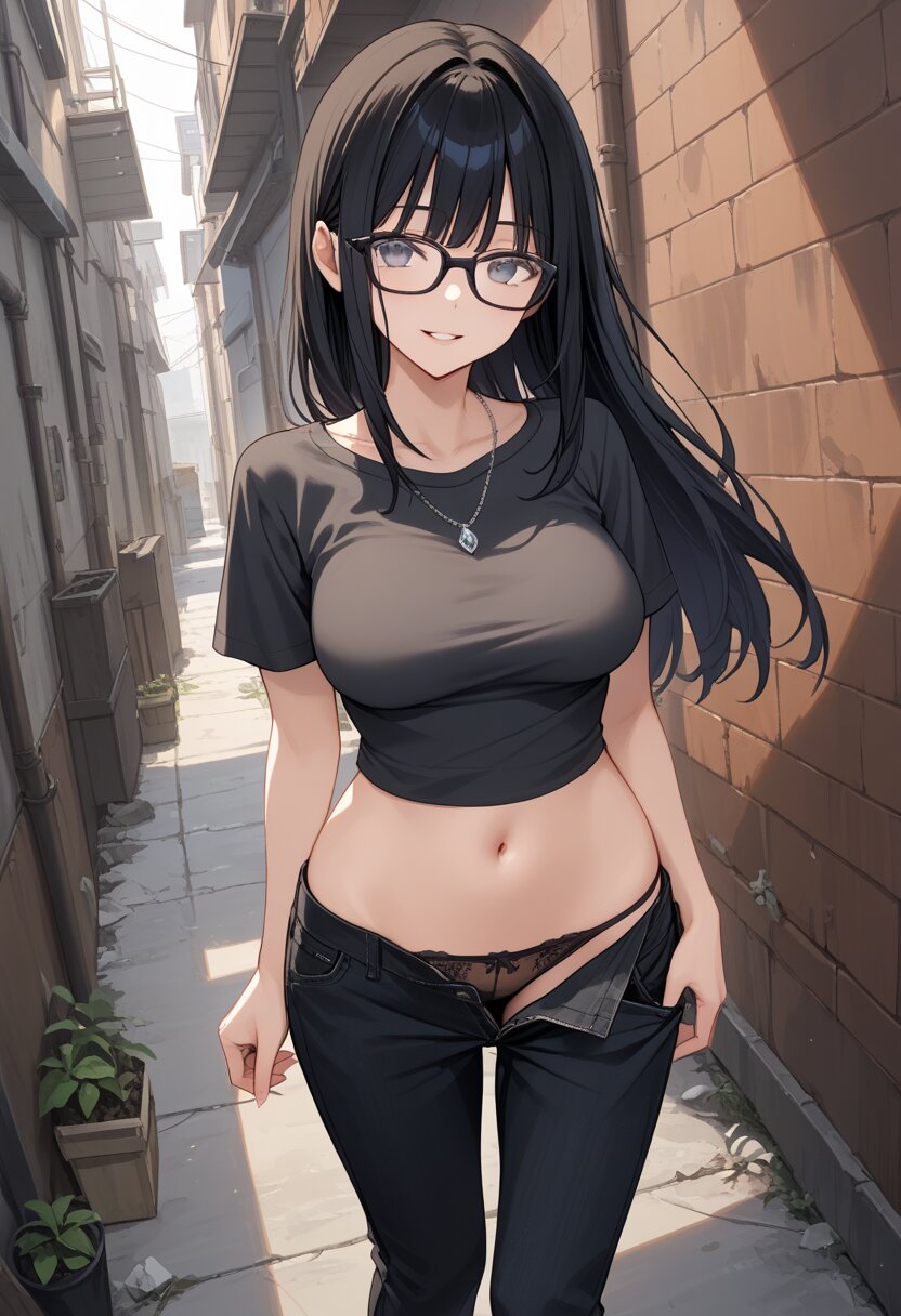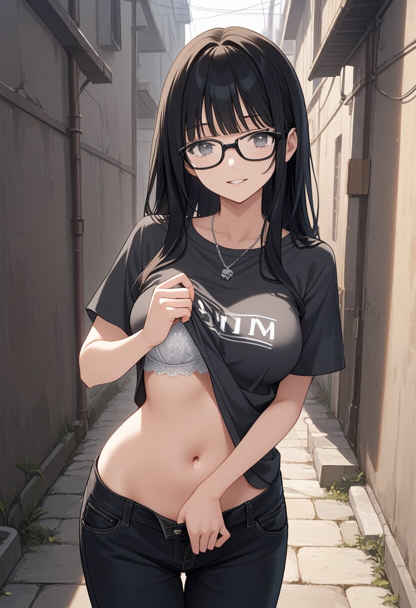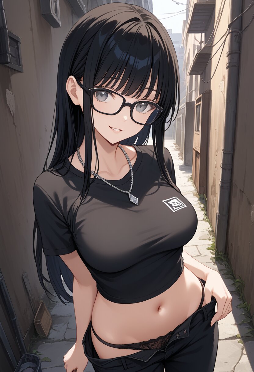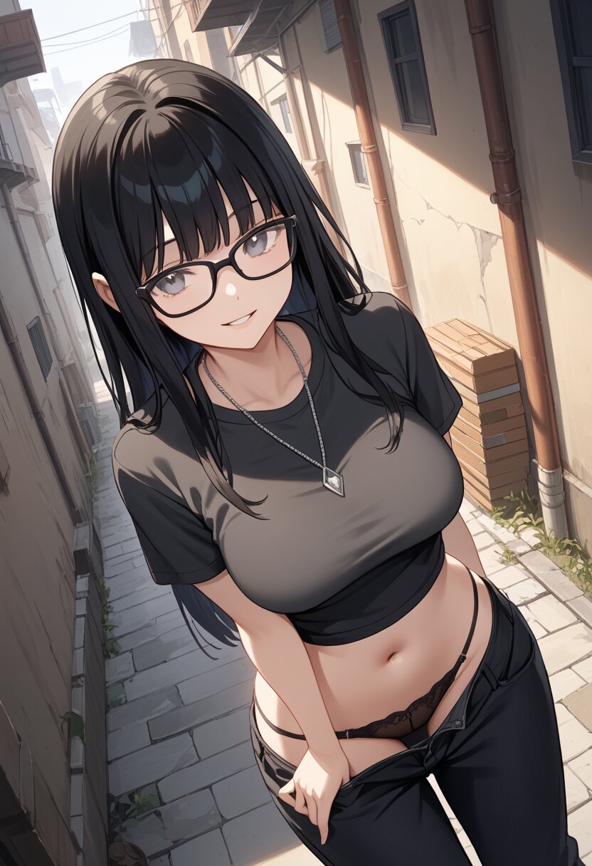 score_9,score_8_up,score_7_up,source anime,best quality,masterpiece,8k,extremely detailed CG unity 8k wallpaper,(dynamic_angle:1.2),bishoujo,medium breasts,gray eyes,black glasses,bangs,cropped gray shirts,navel,short sleeve,silver necklace,alley,black hair,long hair,curvy,black loose pants,(close-up:1.2),(pull forward shirt:1.2),smile,parted lips,black under bra,from_below,