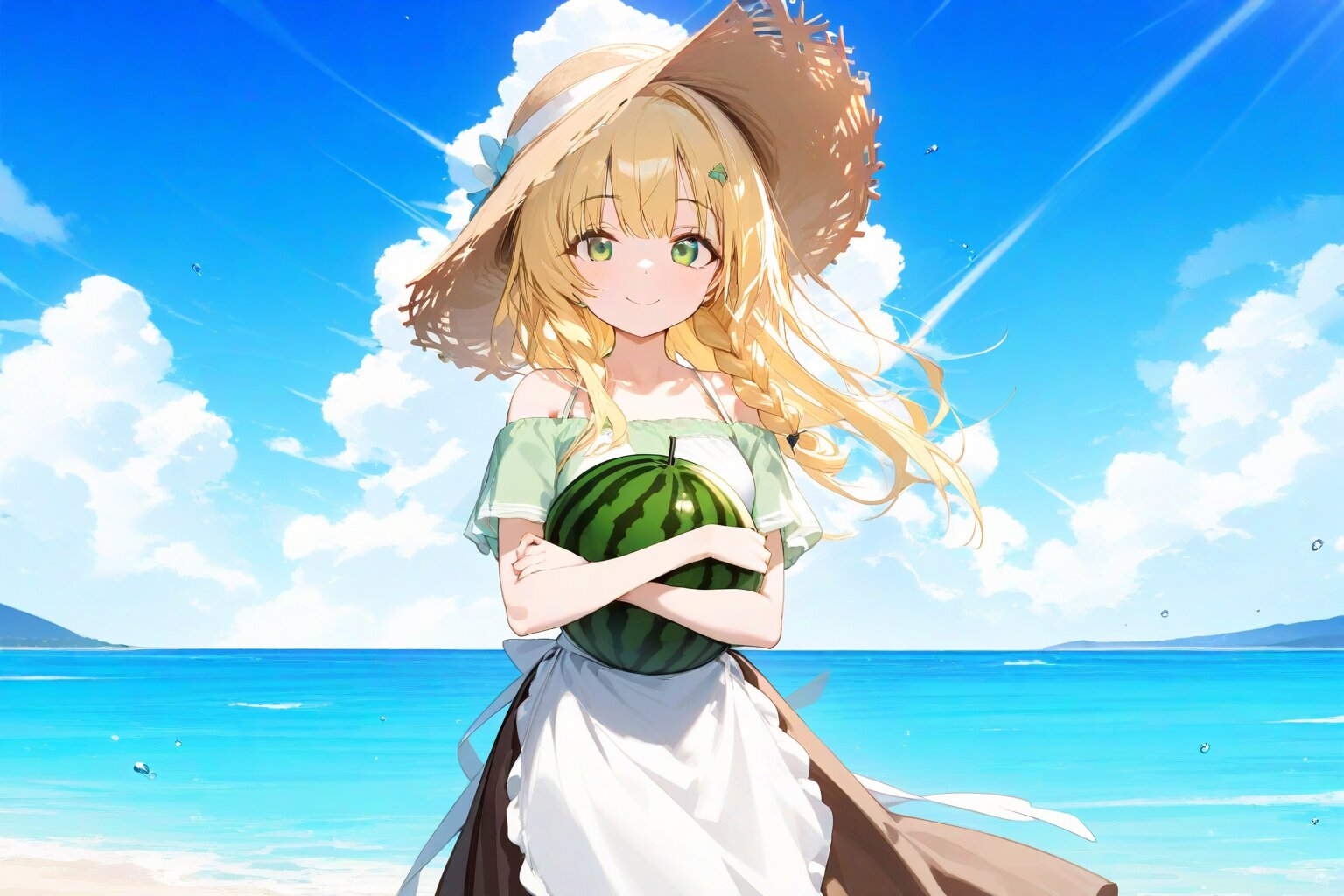 masterpiece, best quality, very aesthetic, absurdres, 1 cute girl, solo, smiling, long hair, straight hair, yellow hair, single braid, side braid, green eyes, long skirt, brown skirt, green blouse, short sleeves, white Apron, straw hat, watermelon, outdoor, blue ocean, beach, blue sky, cowboy shot,