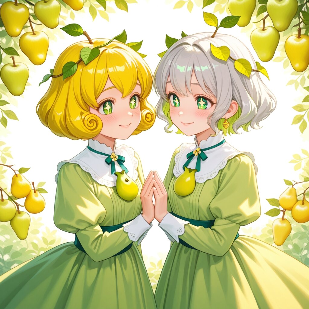 2girls, la france pear, 20th century pear, highly detailed, vibrant colors, fruit girl, silver hair, soft green highlights, gentle blush, elegant dress, pear leaf design, pear skin pattern, pear blossom crown, calm aura, serene smile, expressive eyes, golden hair, playful curls, pear-shaped accessories, lively outfit, yellow and green accents, cheerful expression, sparkling eyes, friendly smile, orchard background, sunlight through leaves, pastel color palette, intricate details, anime style, realistic illustration, depth, delicate shading, vivid colors, masterpiece, ultra detailed