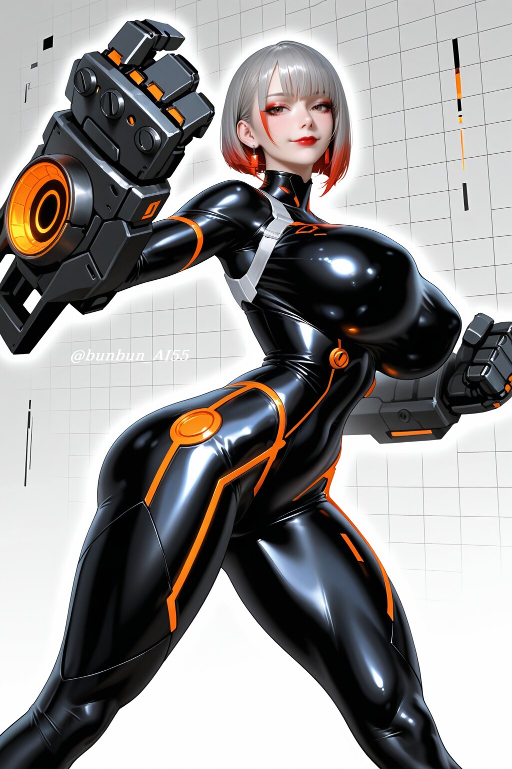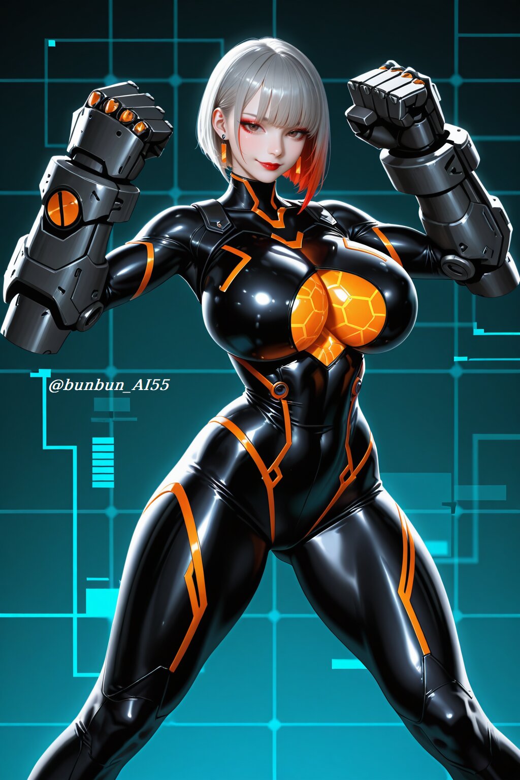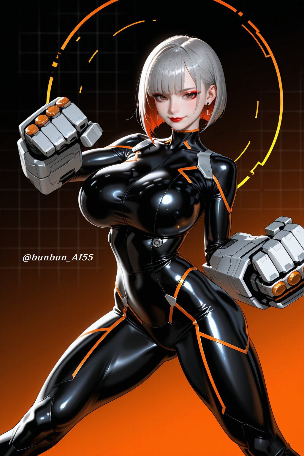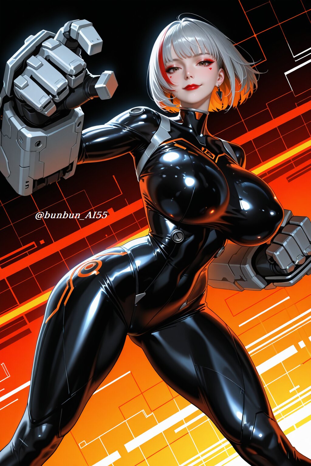 HDR, 8K,masterpiece, best quality, amazing quality, very awa, very aesthetic, absurdres, newest, detailed eyes, realistic eyes, realistic body, highres, add detail, sharp detailes, sharp lines, sharp focus, (realistic, hyperrealistic), sexy style, perfect anatomy, intricate details, high detail RAW color art, high contrast, digital painting, anime style, depth of field, (mechanical, futuristic, cyberpunk), an intricate illustration, BREAK perfect lighting, professional lighting, face lighting, (1girl, elegant beautiful woman:1.5, 22year old), (serious, sexy, model, cool beauty), (beautiful face, slim face, small face, cute face, detailed face, brown eyes, model makeup, red lips), (looking at viewer, alluring gaze, seductive smile), BREAK nsfw, (gray bob cut with red highlights), (jewelry, piercing, earrings), (huge breasts, pointy breasts), (long legs, thick thighs), (perfect hands), (shiny skin, glossy skin), (super model body:1.2, muscle body:1.2, slim body, athletic body:1.2), BREAK (wearing a sleek black futuristic-style bodysuit with neon orange lines with strategic cutouts on body and legs:1.5, clothing cutout:1.3, intricate design:1.2), (gigantic mechanical gauntlets:1.2), (light reflections), (shiny, glossy, luster, latex), (tight fit), BREAK (standing, legs apart, dynamic pose, dynamic action pose, ready for battle pose, heroic pose, fighting pose:1.3), (holographic geometric pattern, glitch background, digital grid), (face focus shot:1.3, medium shot:1.2, dynamic angle),