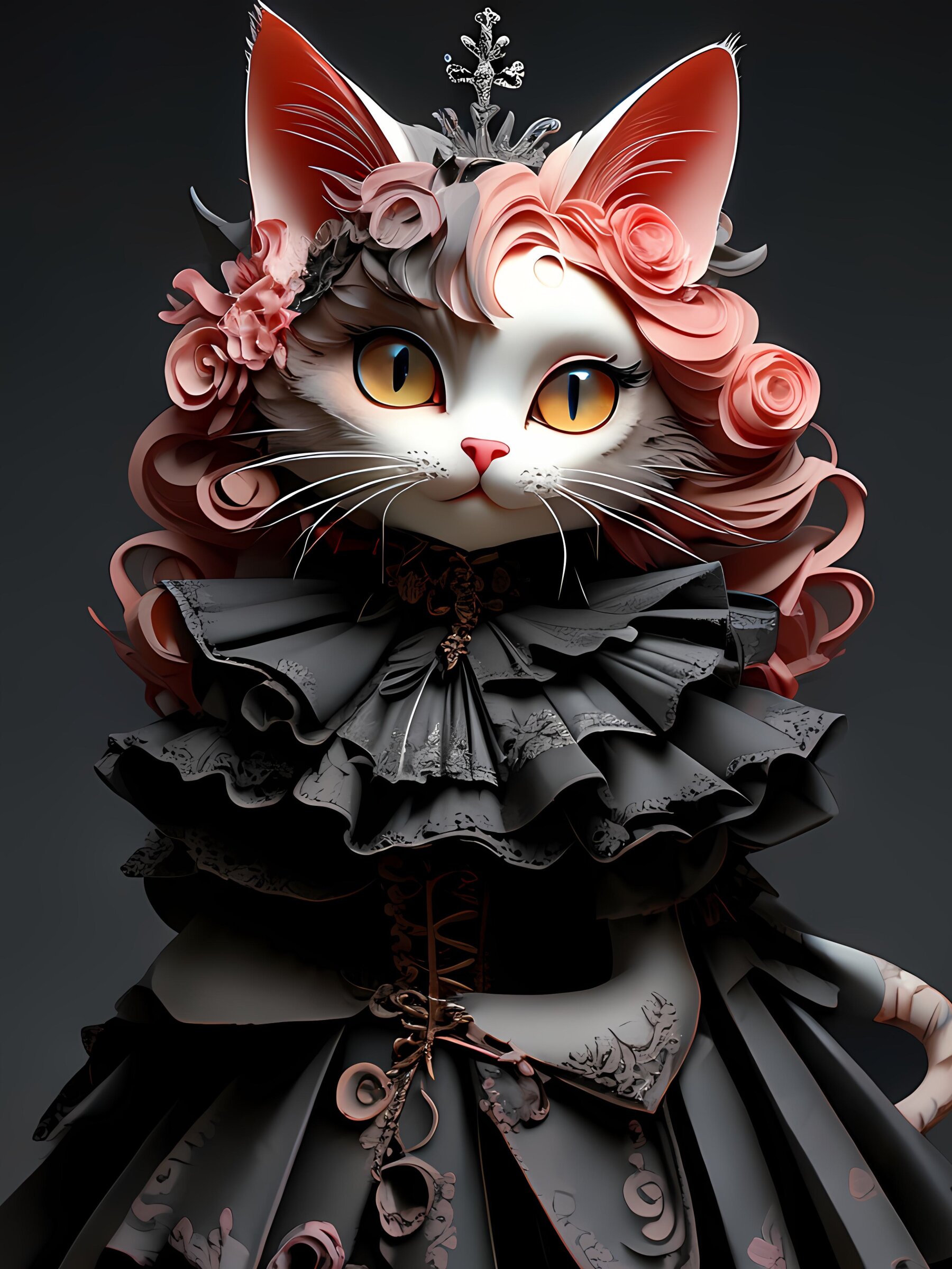 paper craft. 3D graphical paper craft. The cat. anthropomorphism. wearing a gothic princess dress. rich hair. hairstyle. high class. expression pose. The artwork should be in ultra-high definition, 8K resolution, with sharp focus and cinematic composition,ultra-high resolution. extreme fine depiction. —cfg 12 steps 60. sampler Heun.
