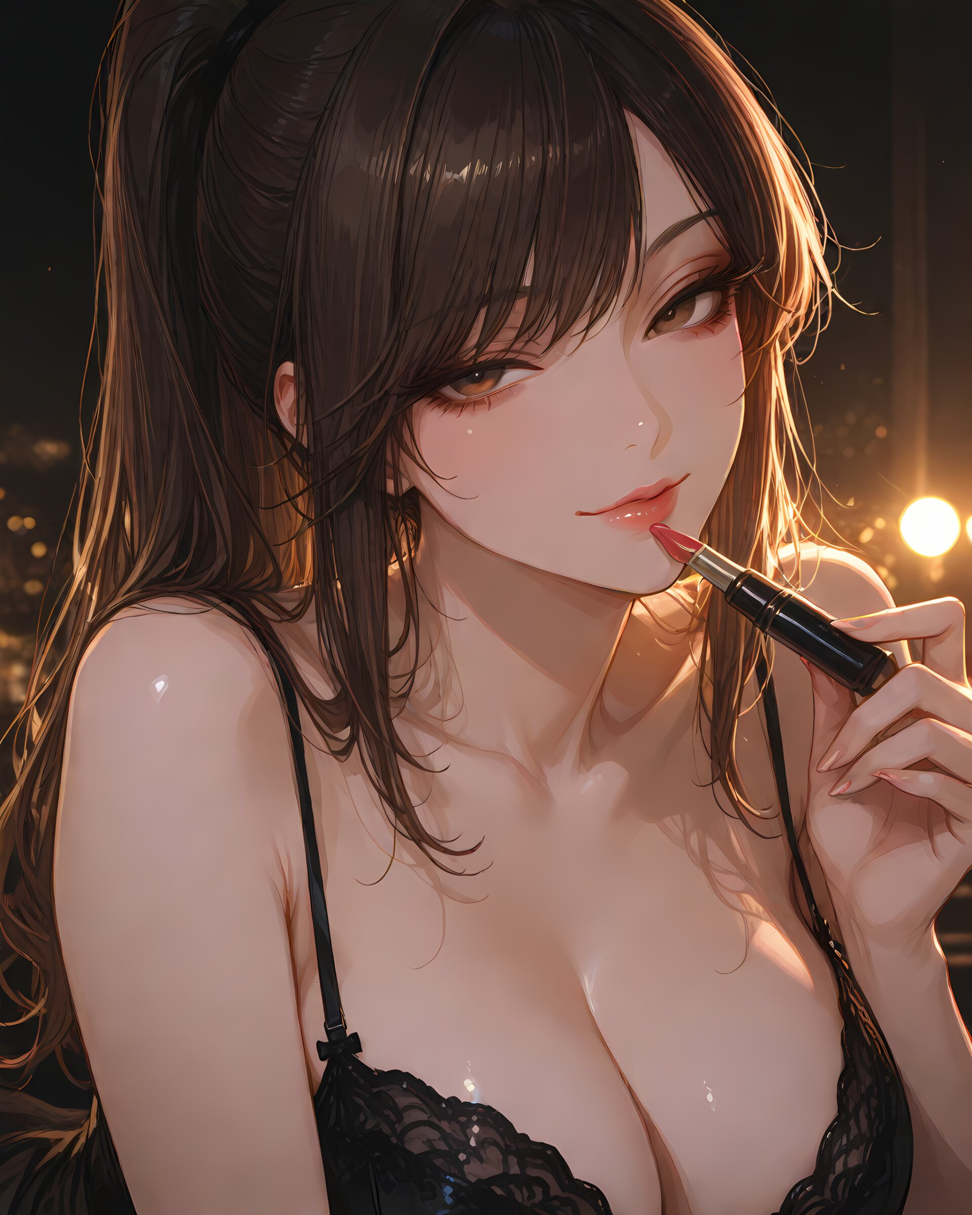 <lora:hyper_sdxl_8_step_lora_f16:1>,, 1girl, applying mascara to eyelashes, holding mascara wand, thick long lashes, glossy eyes, sultry gaze, half-lidded eyes, slightly parted lips, seductive confident smile, extreme close-up on face, focus on eye, eyeliner visible, soft ambient glow, cinematic lighting, BREAK beautiful lady, Married woman, 30 years old, (brown hair), swept bangs, high ponytail, large breasts, sexy black lace lingerie, seductive smile, BREAK masterpiece, amazing quality, best quality, ultra-detailed, 8K,