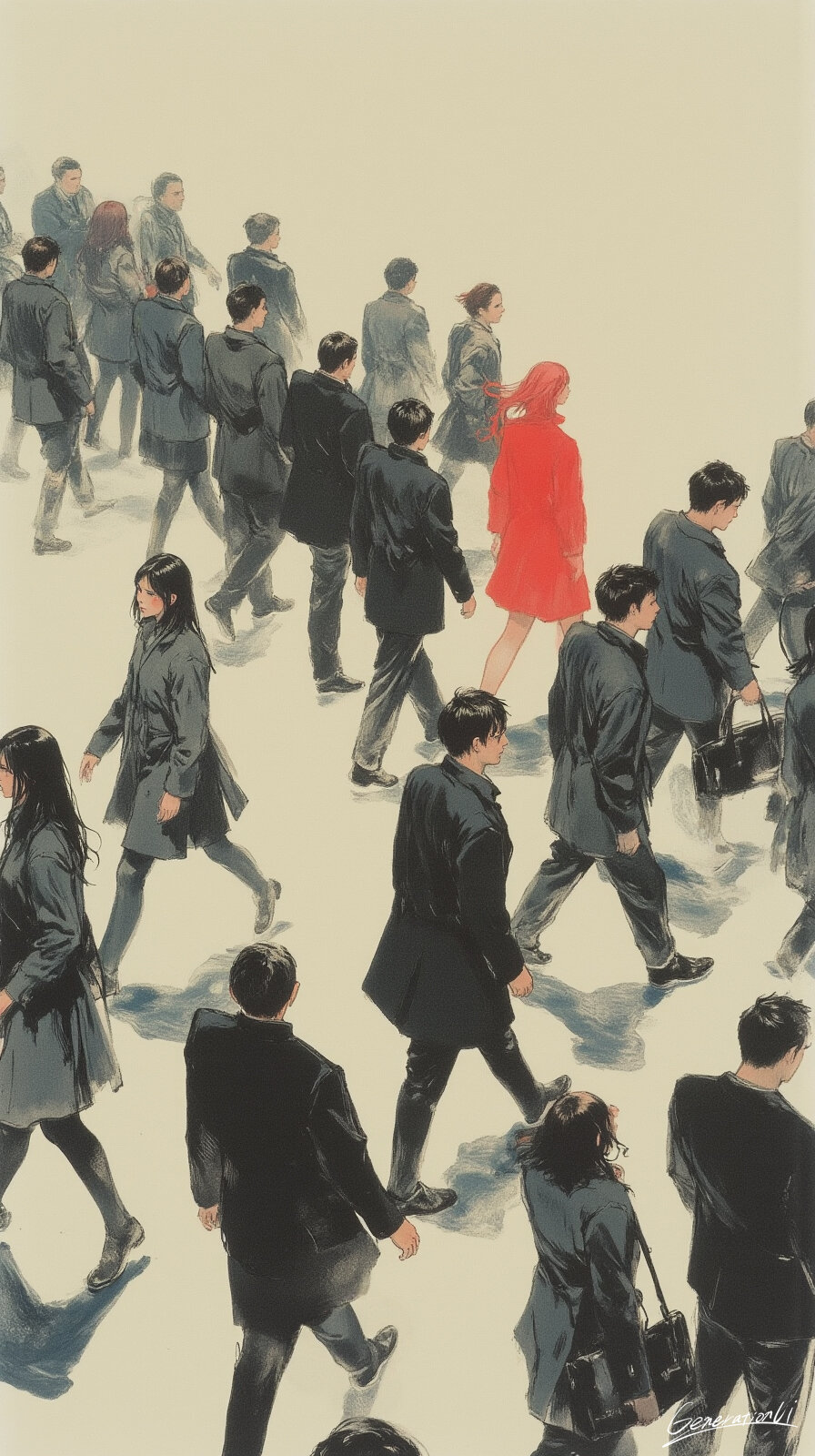 無数のグレーコートが、塩気すら感じない無味の行進をつくる。