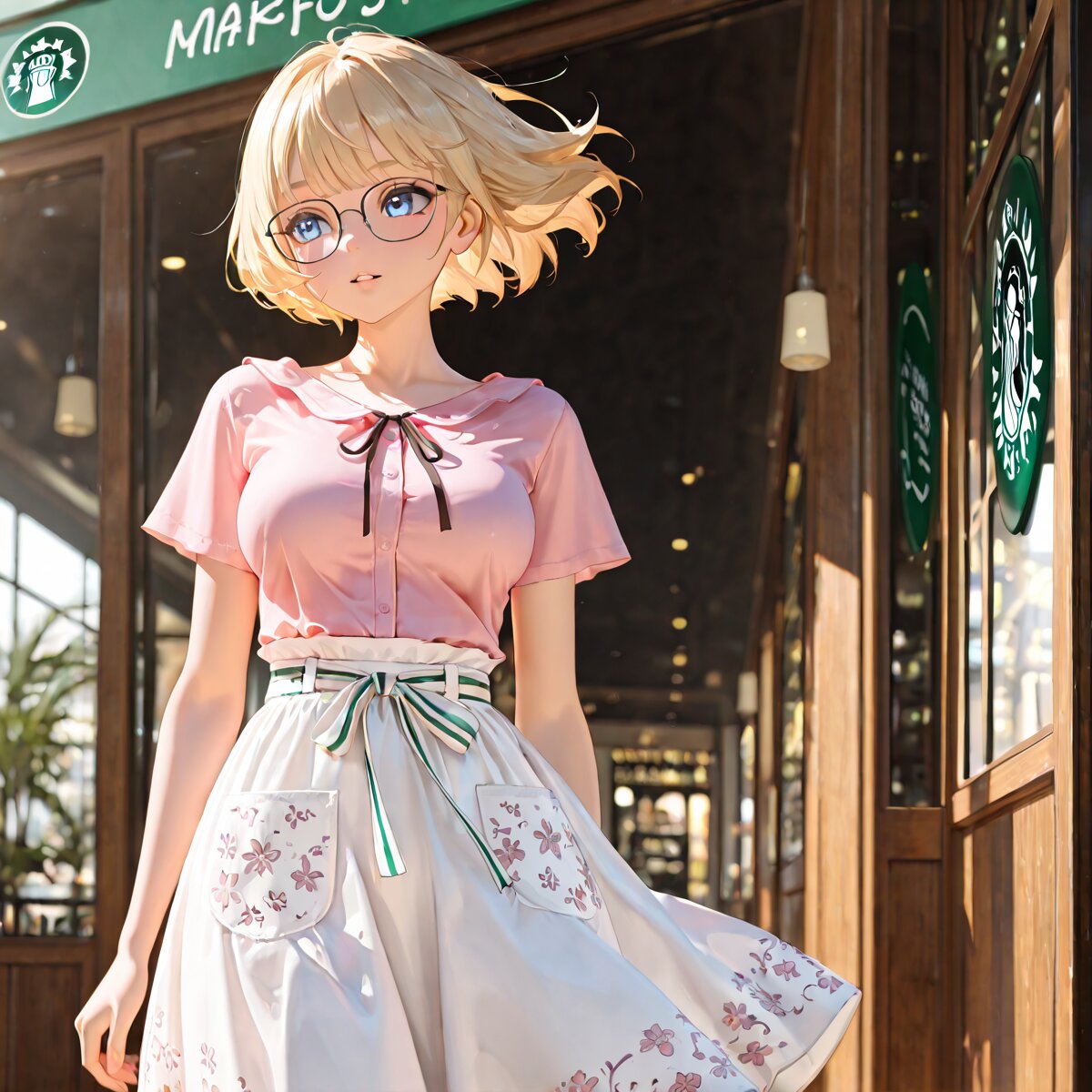 masterpiece, best quality, amazing quality, 4k, very aesthetic, high resolution, ultra-detailed, absurdres, newest, scenery, 3d, rendered, 1girl, solo, glasses, blonde hair, short hair, mild cheerful, choppy bangs, parted lips, blue eyes, Starbucks cafe, (Pink blouse:1.4), short sleeves, small floral pattern,(white flare skirt:1.2),waist apron with waist tie,ribbon tie, medium breasts, dynamic, cowboy shot, front view, facing forward, looking straight ahead, soft lighting, floating hair, BREAK, hands, vignetting, dramatic shadow, cinematic lighting, rim light, detailed background, depth of field, vignetting, volumetric lighting
