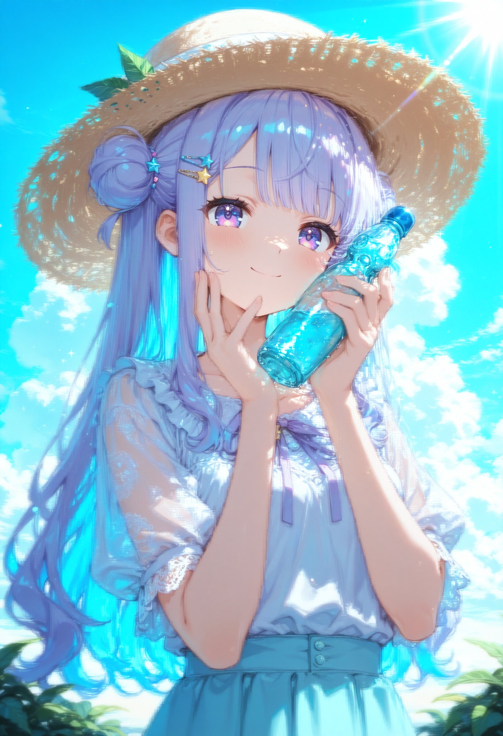 (masterpiece:1.2), (best quality:1.3), amazing quality, high detail, solo, upper body, cute anime girl with a cheerful smile, long silky purple hair with vivid light blue inner highlights, twin buns with loose side hair, sparkling purple eyes, light summer outfit, flowing short-sleeve white blouse with lace sleeves, pastel lavender flared skirt with soft frills, holding a chilled glass bottle of ramune gently against her cheek, playful and refreshed expression, condensation on the bottle, sunlight reflecting through the glass, "cold~!" moment, wearing a straw hat with a pastel ribbon, hair and skirt swaying in the summer breeze, standing under a bright blue sky with radiant white clouds, fresh green leaves in the background, warm sunlight, soft glow and pastel sparkles, dreamy watercolor texture, soft pastel color palette, thin delicate lineart, translucent accents, fluffy lighting, magical gentle atmosphere, subtle rainbow tones, cinematic framing, floating petals, star and heart motifs, soft frills, faint clouds, cute accessories, soft anime face, teenage, pastel purple hair, (light blue inner hair:1.3), fluffy long hair, loosely wavy hair, soft flowing hair, straight-cut bangs, star-shaped hairpin, calm violet eyes,