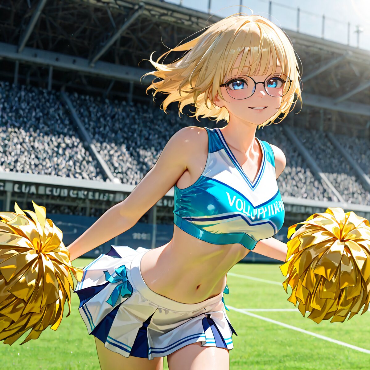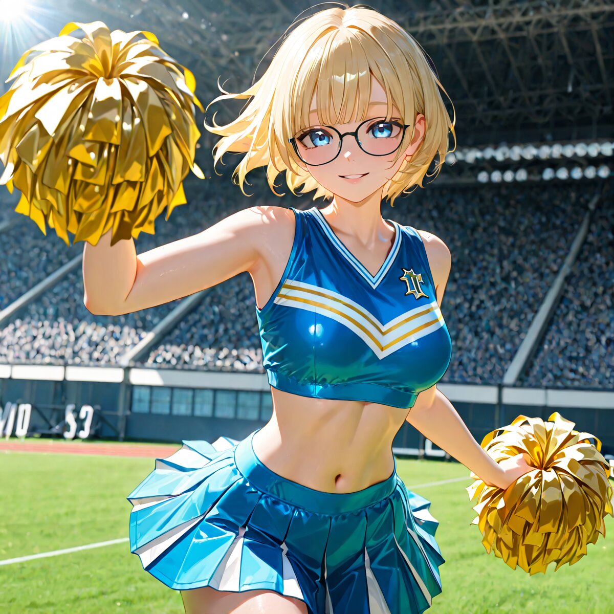 masterpiece, best quality, amazing quality, 4k, very aesthetic, high resolution, ultra-detailed, absurdres, newest, scenery, 3d, rendered, 1girl, solo, glasses, blonde hair, short hair, choppy bangs, parted lips, blue eyes, pom-poms in hand, smiling cheerleader on sports field, medium breasts, dynamic, cowboy shot, front view, facing forward, looking straight ahead, soft lighting, floating hair, BREAK, hands, vignetting, dramatic shadow, cinematic lighting, rim light, detailed background, depth of field, vignetting, volumetric lighting